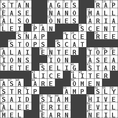 ACROSS 1. Comedian Laurel of Laurel & Hardy 5. Ripens 9. Hit sharply and swiftly 12. Relaxation 13. Billionth: prefix 14. Shopping center 15. In addition 16. Washington bills 17. Roberta Peters solo 18. Luau accessory 19. Baking dish 21. Odor 22. Fastener 24. Frozen water 26. To sift 27. Obstructs or blocks passage 28. Scram, to a cat 29. Jai ____ 30. Keyboard key 32. Drink excessively 36. Charged atoms 37. Electrically charged atom 38. Toward the sea 39. Wig 40. Major League Baseball Commissioner Bud 42. Play the lead 43. Louse (plural) 44. 61 cubic inches 46. White ___ sheet 49. "We ___ not amused" (Victoria) 50. Presage 51. Long narrow piece of something 53. Electrical Unit 54. Cunning 57. Stated 58. Thailand, formerly 61. Hub of activity 62. Toward shelter 63. One of the Great Lakes 64. Morally bad or wrong 65. Cartoonist voice _ Blanc 66. Merit 67. Famous astronaut Armstrong DOWN 1. Lick closed 2. Story 3. Aide 4. Modern: prefix 5. Soon (poet.) 6. Separate the seeds from cotton 7. Compass dir. 8. Mayday 9. More valued for its uncommonness 10. Place in a line 11. Food holder 14. Big _ 19. Infant food 20. Domed church section 21. Arrange properly for use 23. Annoying sound 24. Ancient Celtic tribe of eastern Britain 25. Auto 27. _ gin 28. Took without asking 29. Small island 31. Sibling's daughter 32. Clothes sense 33. Clearly or manifestly demonstrative 34. Lightbulb-shaped fruit 35. Hearing organ 40. Title for a knight 41. Seize upon or latch onto something 43. Pet locale 45. Naughty child 46. Indian state 47. Lacking originality or spontaneity 48. Satellite of Uranus 52. Binary compound 53. So be it 55. 57 in ancient Rome 56. Shout 58. Observe 59. Retirement account (abbr.) 60. Wind 61. Layer