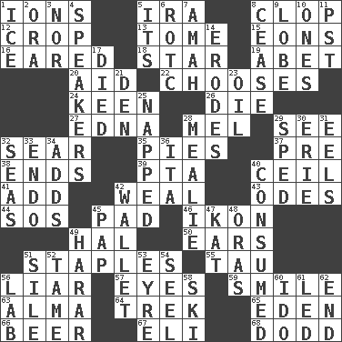 ACROSS 1. Charged atoms 5. Lyricist Gershwin 8. Hoof sound 12. Riding implement 13. Heavy book 15. Immeasurably long periods of time 16. Having ears or earlike features 18. Play the lead 19. Collude with 20. Assist 22. Opts 24. Peachy ____! 26. Expire 27. Pulitzer Prize-winning author Ferber 28. Cartoonist voice _ Blanc 29. Perceive with the eye 32. Burn superficially 35. Sliced desserts 37. Before (prefix) 38. Extremities 39. Parent Teacher Association (abbr.) 40. To provide with a ceiling 41. Find the sum of 42. Welt 43. Lyric poems 44. Mayday 45. Writing tablet 46. Picture 49. Actor Linden 50. Hearing organs 51. Paper fasteners 55. The 19th letter of the Greek alphabet 56. One who doesn't tell the truth 57. Snake ____ (dice throw) 59. Grin 63. _ mater 64. Long journey 65. Paradise 66. Fermented drink made from hops 67. Biblical high priest 68. Texas town _ City DOWN 1. Frozen water 2. Mouth or opening 3. And not 4. Orators 5. ___ a Wonderful Life 6. College mil. group 7. Nanny 8. Stop 9. Ear part 10. Singles 11. Pacific Standard Time (abbr.) 14. Eats (away) 17. Passed on 21. Lair 23. Lubricate 25. Slept 28. Ear of corn 29. Hurried 30. 4th largest of the Great Lakes 31. Snakelike fish 32. Oceans 33. Inside; within (prefix) 34. Does sums 36. Call ___ day 40. Eaten 42. Place for singles 45. Infant food 47. Krazy ___ of comics 48. Mouths or openings 49. Ethiopian city, capital of Harari 51. Filth; sediment 52. Not wild 53. Jane of fiction 54. Sew up the eyelids of hawks and falcons 56. Experiment locale 58. What Jean-Claude Killy likes to do 60. Wedding promise 61. Directed 62. Conclusion