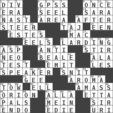 ACROSS 1. HTML Container Element 4. Global Positioning Systems (abbr.) 8. At one time in the past 12. Period 13. Sew up the eyelids of hawks and falcons 14. "Two Mules for Sister ____" 15. Political cartoonist Thomas 17. Length times width 18. Following 19. Navigate 21. _ Mahal 23. Car or cant ending 24. _____ Park, CO 26. Apple computer (short form) 28. Snakelike fish 30. Preparing or cooking with lard 34. Viper 37. Against 39. Use a spoon 40. Modern: prefix 41. Memphis, Tenn. Street 43. In the manner of 44. Trial 46. Give off 47. French article 48. Orator 51. In a ____ (agitated or irritated) 54. Turn to the right 55. Odor 58. Pull behind 61. Pipe bend 63. Collect or gather 65. Constellation of myth 67. Silent film actress Nazimova 71. Singer James 72. Friends 73. Count _ (2 wds.) 74. Title for a knight 75. Inside; within (prefix) 76. Singer Brickell 77. RI univ. DOWN 1. Hiding places for outlaws 2. Feeling or showing extreme anger 3. Flower holders 4. Girls' org. (abbr.) 5. For each 6. Perceive with the eye 7. Narrow board 8. Order of Saint Francis (abbr.) 9. Nathan's nickname 10. Algonquian 11. Merit 16. False hair 18. Partly open 20. To separate or throw off 22. Housemaid (var.) 25. Thick slice 27. Music discs 29. Contemptuous expression 30. Ms. Damita and namesakes 31. Slanted text style (abbr.) 32. The longest river in the world 33. Pate de foie ____ 34. Pismires 35. Ooze 36. Introduce or present, as a question 38. Scottish cap 42. Inactive volcano in Sicily 45. Label 49. Peachy ____! 50. Snakelike fish 52. Retirement account (abbr.) 53. Heavy book 56. Taiwanese island in East China Sea 57. Having gotten out of bed 58. Drink excessively 59. Northwest Algerian city 60. Rampant 62. Unable to walk 64. Indian skirt 66. Bear (Spanish) 68. Directed 69. Cards in a Roman deck? 70. One (Scot)