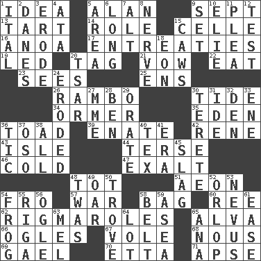 ACROSS 1. It may be bright or harebrained 5. ____ Jay Lerner 9. Back-to-school mo. 13. Small pie 14. Hero or heavy, e.g. 15. Cell (Danish) 16. Small Philippine buffalo 17. Pleas 19. Directed 20. Label 21. Solemn pledge 22. Erode 23. Perceives with the eye 25. Followers of ems 26. Role for Stallone 30. Periodic rise and fall of the sea level 34. Channel Islands abalone 35. Locale of original sin 36. Frog relative 39. Maternal 42. French philosopher Descartes 43. Capri or Wight 44. Laconic 46. Lacking warmth 47. Honor 48. Small child 51. Period of immesurable duration 54. From 57. Armed conflict 58. Paper or plastic container 60. To riddle 62. Frustrating wastes of time 65. Inventor's middle name 66. Stares 67. Short-tailed, large-bodied rat 68. Horse sense 69. Highlander 70. Singer James 71. Domed church section DOWN 1. Slanted text style (abbr.) 2. Natives or inhabitants of Denmark 3. Eat (away) 4. _ moment's notice (2 wds.) 5. Length times width 6. Protracted 7. Keyboard modifier key 8. Boldness 9. Arrange properly for use 10. Writer Wiesel 11. Entreaty 12. Trial 15. Crow sounds 18. A really long time 20. Russian ruler of old 24. Worn away 27. Madame (abbr.) 28. Benjamin's nick name 29. Speak pompously 30. Cigar-shaped 31. Binary compound 32. Lair 33. Compass dir. 36. Nervous spasm 37. Bear (Spanish) 38. 100% 40. John Ritter's dad 41. Period 45. Volcanic refuse 48. It was, poetically 49. Rowing implement 50. Collection of objects 52. Fourth or lowest deck 53. Congenital growth or mark on the skin 54. Tree-dwelling hopper 55. Capital of Latvia 56. Stare 58. Waist strap 59. At sea 61. Relaxation 63. Cartoonist voice _ Blanc 64. Car dealer's back yard 65. Santa ___, CA