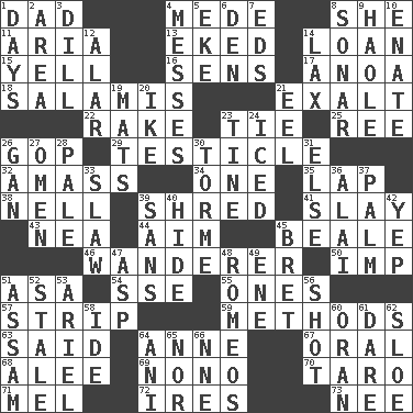 ACROSS 1. June honoree 4. Ancient Persian 8. A female animal or person 11. Operatic vocal solo 13. Supplemented with great effort 14. Grant temporary use of 15. Shout 16. Elected reps. 17. Small Philippine buffalo 18. Deli grouping 21. Glorify 22. Immoral or dissolute person 23. Standoff 25. To separate or throw off 26. Republican Party 29. A testis 32. Collect or gather 34. Single 35. Infant locale 38. 1994 drama film starring Jodie Foster 39. Tear up 41. Kill 43. Teachers' org. 44. Direct toward a target or goal 45. Memphis, Tenn. Street 46. Nomad 50. Mischievous child 51. White ___ sheet 54. Compass dir. 55. Singles 57. Remove all contents or possession from 59. Modes 63. Stated 64. Queen of England 1702-14 67. Spoken 68. Toward shelter 69. Words to Nanette 70. Edible starchy tuberous root 71. Cartoonist voice _ Blanc 72. Angers 73. Born DOWN 1. 24-hour periods 2. Length times width 3. Deli pickle 4. Makes clutter 5. Make supply last 6. Lair 7. Begley and Asner 8. Underwater navigation system 9. White Person, in Hawaii 10. Maternal 12. Having or resembling wings 14. Not strict 19. Floor protectors 20. Mamie's husband 21. Snakelike fish 23. Prong on a fork 24. On the rocks 26. Separate the seeds from cotton 27. Sign of something about to happen 28. Light colored 30. Singer Mel 31. Otherwise 33. Cole _ (cabbage dish) 36. Jai _ 37. Inside of hand 39. Without 40. Flintstone garb 42. Slangy assent 45. Cy Young winner Saberhagen 47. Viper 48. Lover boys 49. Compass dir. 51. Indian state 52. Showing deterioration from age 53. Satellite of Uranus 56. Attempt 58. Binary compound 60. NW Algerian seaport 61. Have the gumption 62. A type of plum 64. Black tropical American cuckoo 65. And not 66. Compass dir.