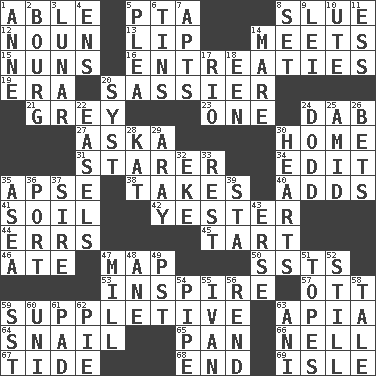 ACROSS 1. Competent 5. Parent Teacher Assoc. 8. Change direction abruptly 12. Part of speech 13. Mouth edge 14. Confronts 15. Religious women 16. Pleas 19. Period 20. More disrespectful 21. Jennifer or Joel 23. Single 24. Small moist lump or mass 27. "____ silly question..." 30. Dwelling 31. A viewer who gazes fixedly 34. Prepare for publication 35. Domed church section 38. Proceeds 40. Sums up 41. Land 42. Last 44. Blunders 45. Small pie 46. Had dinner 47. Atlas unit 50. Fast planes 53. Heighten or intensify 57. Baseball player Mel 59. Supplementary 63. Capital of Western Samoa 64. Slow-paced one 65. Baking dish 66. 1994 drama film starring Jodie Foster 67. Event that recurs at intervals 68. Conclusion 69. Small island DOWN 1. Singer Murray 2. French market town 3. Type of eclipse 4. Followers of ems 5. Entreaty 6. Canisters 7. Tenement units (abbr.) 8. Put into a specified state 9. Flowery wreath 10. Shoshoni 11. Curvy letter 14. Female horse 17. River (Sp.) 18. Car or cant ending 20. System (abbr.) 22. Artist's stands 24. Texas town _ City 25. Among 26. Stakes 28. Krazy ___ of comics 29. Like ___ of sunshine 30. Centers of feelings and intuitions 32. Supplement with great effort 33. Repose 35. Toward the sea 36. Sweet dark-red dessert wine 37. Father 39. R.R. building 43. Celtic language 47. Place where flour is made 48. One (Scot) 49. Pacific Standard Time (abbr.) 51. Drinks excessively 52. Free from disturbance or agitation 54. Corncob 55. "Terrible" tsar 56. Tear apart 58. Falsehood 59. Fast jet (abbr.) 60. University (slang) 61. Writing tablet 62. Sliced dessert 63. Cuckoo