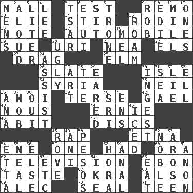 ACROSS 1. Shopping center 5. Trial 9. San ____ (Riviera town) 13. Writer Wiesel 14. Use a swizzle stick 15. "The Thinker" sculptor 16. Short letter 17. Form of transportation 19. Take to court 20. RI univ. 21. Teachers' org. 22. Raised railways 23. To trail on the ground 25. Shade tree 26. Schedule 30. Small island 34. Damascus' land 35. Famous astronaut Armstrong 36. Mine, in Marseilles 39. Laconic 42. Highlander 43. Common sense 44. Bert's buddy 46. "This won't hurt ____!" 47. Flat circles 48. Strike 51. Inactive volcano in Sicily 54. Compass dir. 57. Single 58. Possessed 60. Mouth or opening 62. Household entertainment appliance 65. Inky black, to poets 66. Clothes sense 67. Gumbo ingredient 68. In addition 69. Actor Baldwin 70. Lick closed 71. Adolescent DOWN 1. Not women's 2. Verbally 3. 61 cubic inches 4. Area sheltered from the wind 5. Russian ruler of old 6. Needle holder 7. Be seated 8. Heavy duty weighing machine 9. Director Reiner 10. Singer Brickell 11. Place where flour is made 12. Washington bills 15. Wander aimlessly 18. Cartoonist voice _ Blanc 20. Unsightly 24. Aid 27. Nonscientific branch of learning 28. Neckwear 29. Having ears or earlike features 30. Swallow 31. Ocean 32. Untruth 33. Pipe bend 36. Santa ___, CA 37. Disorderly crowd 38. Fr. "Yes" 40. _ Lanka 41. Followers of ems 45. On the rocks 48. Be footloose 49. Cuckoo 50. Mexican monetary units 52. Impressive in appearance 53. Came up 54. Singer James 55. Actress Patricia 56. Otherwise 58. Israeli folk dance 59. Of or related to the anus 61. At once, immediately (arch.) 63. And so on (abbr.) 64. Eisenhower's nickname 65. Erode