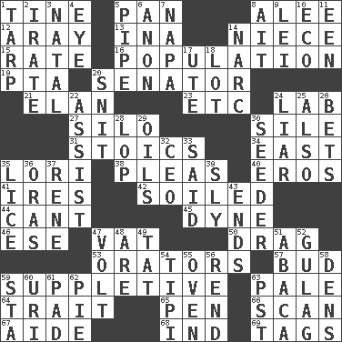 ACROSS 1. Prong on a fork 5. Baking dish 8. Toward shelter 12. Like ___ of sunshine 13. _ tizzy (2 wds.) 14. Sibling's daughter 15. Pace 16. Census information 19. Parent Teacher Association (abbr.) 20. Legislator 21. Liveliness 23. And so on (abbr.) 24. Experiment locale 27. Grain storage tower 30. Filth; sediment 31. Unemotional ones 34. Compass direction 35. Australian parrot (variant) 38. Entreaties 40. Greek god of love 41. Angers 42. Dirtied 44. Patter 45. Unit of force 46. Compass dir. 47. Large container 50. To trail on the ground 53. Speakers 57. Partially opened flower 59. Supplying deficiencies 63. Diluted with white 64. Distinguishing feature 65. Animal enclosure 66. Skim 67. Assistant 68. Indiana (abbr.) 69. Labels DOWN 1. Canvas cover 2. Feeling or showing extreme anger 3. Brizilian seaport 4. Sight organ 5. Corncob 6. Soon (poet.) 7. California wine valley 8. Small island 9. Luau accessory 10. Environmental prefix 11. Car or cant ending 14. Drug cop 17. Shoshoni 18. Car dealer's back yard 20. In a ____ (agitated or irritated) 22. Help 24. One who doesn't tell the truth 25. In addition 26. Stakes 28. Chop off 29. Lubricates 30. Sowing specialist 32. Corporate head (abbr.) 33. Expressed in words 35. Louse (plural) 36. Mouths or openings 37. French philosopher Descartes 39. Roguish 43. Extremities 47. Electrical Unit 48. "We ___ not amused" (Victoria) 49. Make lace 51. Phillipine bananalike plant 52. Russian prison camp 54. Native american tent (variation) 55. Baking chamber 56. Tear apart 58. Habitations of wild animals 59. R.R. building 60. RI univ. 61. Writing tablet 62. Sliced dessert 63. Pacific Standard Time (abbr.)