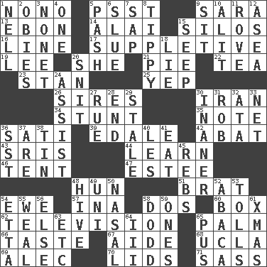 ACROSS 1. Words to Nanette 5. Inconspicuous attention getter 9. "Two Mules for Sister ____" 13. Inky black, to poets 14. Mountain range southwest of Kyrgyzstan 15. Grain storage towers 16. Actor's bit 17. Supplementary 19. Area sheltered from the wind 20. A female animal or person 21. Sliced dessert 22. Beverage made from leaves 23. Comedian Laurel of Laurel & Hardy 25. Slangy assent 26. Fathers 30. SW Asia republic 34. Check the growth or development of 35. Observe 36. Suttee (variant) 39. Peak District village in England 42. Blind as ____ 43. Indian titles of respect 44. Memorize 46. Portable shelter 47. First name in cosmetics 48. Attila the _ 51. Naughty child 54. She-sheep 57. _ tizzy (2 wds.) 58. Two (Sp.) 60. Gift holder 62. Household entertainment appliance 65. Inside of hand 66. Clothes sense 67. Assistant 68. Southern CA. univ. 69. Actor Baldwin 70. Flaplike coverings 71. Backtalk DOWN 1. 1994 drama film starring Jodie Foster 2. Off-Broadway awards 3. Music written for nine 4. Single 5. Romantic infatuation 6. Turn sharply 7. Plant excrement 8. Likely to tip or tilt 9. Be seated 10. Set down 11. Be footloose 12. Toward the sea 15. Ooze 18. Untruth 20. In a ____ (agitated or irritated) 24. Help 27. Sorrow 28. Conclude 29. Having lost freshness 30. More empty; more void 31. Director Reiner 32. "One Day ___ Time" 33. Remaining after all deductions 36. Fast jet (abbr.) 37. "We ___ not amused" (Victoria) 38. Shallow baking pan 40. French article 41. Ingest 45. Confederate soldiers (slang) 48. Hub of activity 49. Single; one (prefix) 50. Rhinal 52. Phillipine bananalike plant 53. For Whom the Bell _____ 54. Singer James 55. Welt 56. Otherwise 58. Texas town _ City 59. Washington bills 61. Dec. holiday 63. And so on (abbr.) 64. One more than two 65. Product of festering
