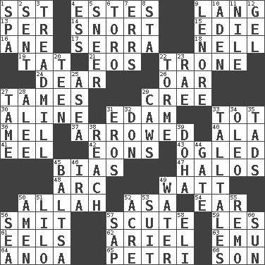 ACROSS 1. Fast jet (abbr.) 4. _____ Park, CO 9. Austrian-born American filmmaker Fritz 13. For each 14. Derisive sound 15. Singer Brickell 16. A saturated hydrocarbon 17. Spanish missionary in California 18. 1994 drama film starring Jodie Foster 19. Make lace 21. Greek goddess of the dawn 22. Heavy duty weighing machine 24. Letter starter 26. Boat paddle 27. Domesticates 29. Algonquian 30. Place in a line 31. Dutch treat 33. Small child 36. Cartoonist voice _ Blanc 37. Moved like an arrow 40. According to 41. Snakelike fish 42. Immeasurably long periods of time 43. Stared at amorously 45. Prejudice 47. Auras 48. Curve 49. Electrical Unit 50. Assad's deity 52. White ___ sheet 54. Hearing organ 56. Stricken, poetically 57. Snake scale 59. French article 61. Snakelike fish 62. Satellite of Uranus 63. Australian flightless bird 64. Small Philippine buffalo 65. _ dish (used to culture cells) 66. Male child DOWN 1. Health resort 2. Transmitted 3. Excercise machine 4. Double-curved letter 5. Contemptuous expression 6. "Corrida" creature 7. Blunders 8. R.R. building 9. Poe poem 10. An important port of Yemen 11. The longest river in the world 12. Set 20. Adolescent 22. Singer Mel 23. Actress Charlotte 25. Toward the sea 27. Docile 28. Toward shelter 29. Crow sounds 31. Greek god of love 32. Spanish title 33. Baron Munchausen's specialties 34. Butter sub 35. Small boys 38. Arrive at 39. Capital of the state of Qatar 44. Yard entry 45. Greek mezzo-soprano Agnes 46. Retirement account (abbr.) 49. Wetness 50. So be it 51. _ and Stitch 52. 1/640 square mile 53. Costume for a special activity 55. San ____ (Riviera town) 56. Ocean 57. Plant excrement 58. Connecticut Ivy Leaguer 60. Player for Phoenix