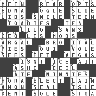 ACROSS 1. Count _ (2 wds.) 5. Bring up, as a child 9. Chooses 13. Pulitzer Prize-winning author Ferber 14. Stare at amorously 15. Change direction abruptly 16. Flaplike coverings 17. Grin 18. Adolescent 19. Sycophants 21. Afternoon social gathering 22. _ and Stitch 23. Without 24. Corporate head (abbr.) 27. French article 28. Disorderly crowds 29. Therefore, facetiously 31. Sis' sibling 32. Slanted text style (abbr.) 36. Sliced desserts 37. Fr. "Yes" 38. Grand slam 39. Perceives with the eye 40. Bank Draft (abbr.) 41. Viva Las _ 42. Is not 44. Frozen water 46. Small island 47. American tennis player Robert 48. To provide with a ceiling 50. Had dinner 51. Fools 54. Israeli folk dance 56. Choose 58. (Had) reclined 60. Soon (poet.) 61. Lick closed 62. Small island 63. Undesirable depression on a surface 64. Not divided or shared with others 65. Portico DOWN 1. Cartoonist voice _ Blanc 2. Prepare for publication 3. Southeast Asian peninsula 4. Relating to the nose 5. Lover boys 6. Armor plate that protects the chest 7. Everything 8. To separate or throw off 9. Clearly or manifestly demonstrative 10. Entreaties 11. Third day of the wk. 12. Elected rep. 17. Filth; sediment 20. Deli pickle 21. Keyboard key 23. "Barney Miller" actor Jack 24. Balmoral and tarboosh 25. One of the Great Lakes 26. Double curve, resembling the letter S 28. Medical imaging device (abbr.) 30. Helper 31. On the contrary 33. Ancient Roman robe 34. Jai _ 35. For fear that 37. Often (poetically) 40. Compass dir. 41. Distinctive style or manner 43. A female animal or person 44. Tapering mass of hanging ice 45. Penny 47. Composer Copland 49. Ms. Damita and namesakes 51. Actress Patricia 52. 90 degrees 53. Grain storage tower 54. Possessed 55. Single 56. Double-curved letter 57. Lion 59. Teachers' org.