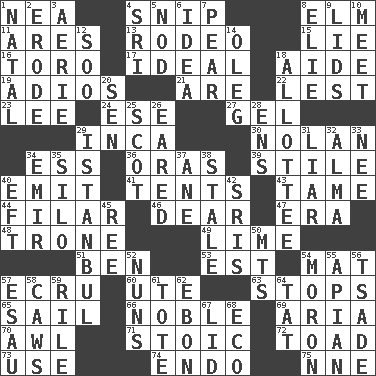 ACROSS 1. Teachers' org. 4. Clip 8. Shade tree 11. Ancient Greek god of war 13. Cowboy competition 15. Untruth 16. "Corrida" creature 17. Perfect 18. Helper 19. Goodbye (Sp.) 21. "We ___ not amused" (Victoria) 22. For fear that 23. Area sheltered from the wind 24. Compass dir. 27. Set 29. South American Indian 30. Pitcher Ryan 34. Double-curved letter 36. Mouths or openings 39. Vertical member of a panel or frame 40. Send forth 41. Portable shelters 43. Docile 44. Having threads 46. Letter starter 47. Period 48. Marketplace scale 49. Citrus frut 51. Benjamin's nick name 53. Eastern Standard Time (abbr.) 54. Floor protector 57. Shade of tan 60. Shoshoni 63. Halts 65. Move on water 66. Impressive in appearance 69. Operatic vocal solo 70. Leather borer 71. Unemotional 72. Frog relative 73. Purpose 74. Inside; within (prefix) 75. Compass dir. DOWN 1. Relating to or accompanying birth 2. Eat (away) 3. Nest on high 4. _ Lanka 5. Lower and raise head in agreement 6. It may be bright or harebrained 7. Lightbulb-shaped fruit 8. Writer Wiesel 9. Flaplike coverings 10. Confront 12. "Barney Miller" actor Jack 14. Cassini of fashion 18. One to whom something is allotted 20. Elected rep. 25. Native of Scotland 26. Having ears or earlike features 28. Followers of ems 29. Byzantium, centuries later 31. One who doesn't tell the truth 32. _ mater 33. Born 34. Independent ruler or chieftain 35. Grain storage tower 37. A saturated hydrocarbon 38. Lacking originality or spontaneity 40. Newt 42. Indian titles of respect 45. To riddle 50. Mountains (abbr.) 52. Religious women 54. Person of subnormal intelligence 55. Bee-related 56. Sadhe (variant) 57. He sold his birthright 58. Crow sounds 59. Cause heat under the collar 61. Haul 62. Inky black, to poets 64. Make lace 67. Flaplike covering 68. Environmental prefix