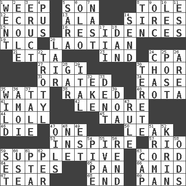 ACROSS 1. Shed a tear 5. Male child 8. Lacquered or enameled metalware 12. Shade of tan 13. Chicken ___ king 14. Fathers 15. Horse sense 16. Homes 19. Affectionate concern, for short 20. Of or relating to Laos or its people 21. Singer James 23. Indiana (abbr.) 24. Accounting whiz (abbr.) 27. Swiss mountan, "Queen of the Mountains" 30. Son of Odin 31. Spoke pompously 34. Comfort 35. Electrical Unit 38. Swept the length of 40. Round or rotation of duties 41. "If ____ say so..." 42. Poe poem 44. Hang loosely or laxly 45. Pulled tight 46. Expire 47. Single 50. Path through which fluid escapes 53. Heighten or intensify 57. River (Sp.) 59. Supplying deficiencies 63. Drawstring 64. _____ Park, CO 65. Baking dish 66. Among 67. Pull apart 68. Conclusion 69. Zero-star reviews DOWN 1. Gone 2. Learning spot: Fr. 3. Spew [out] 4. Fluid product of inflammation 5. "Two Mules for Sister ____" 6. Butter sub 7. Political cartoonist Thomas 8. Metal container 9. The grampus (Milton) 10. Area sheltered from the wind 11. Curvy letter 14. Transmit 17. One more than two 18. Daniel's nick name 20. Den 22. Trinitrotoluene 24. US Secretary of Labor Elaine L. _ 25. Mail 26. Type of rug 28. Slender fish 29. Slanted text style (abbr.) 30. Cylindrical with tapered ends 32. Make supply last 33. Gouge 35. Uncontrolled 36. Mine, in Marseilles 37. Falsehood 39. ___ good deed 43. General guideline 47. Petroleums 48. Compass dir. 49. Eastern Standard Time (abbr.) 51. Odor 52. Japanese brewing company 54. Corncob 55. "Terrible" tsar 56. Tear apart 58. Likelihood 59. Put into a specified state 60. Purpose 61. Parent Teacher Association (abbr.) 62. For each 63. Head covering
