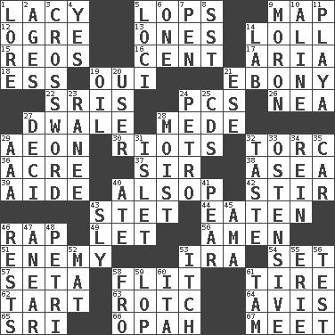 ACROSS 1. Made of lace 5. Chops off 9. Atlas unit 12. Legendary monster 13. Singles 14. Hang loosely or laxly 15. Vintage cars 16. Penny 17. Operatic vocal solo 18. Curvy letter 19. Fr. "Yes" 21. Black 22. Indian titles of respect 24. Personal Computers (abbr.) 26. Teachers' org. 27. A sleeping potion; an opiate (poet.) 28. Ancient Persian 29. A really long time 30. Debaucheries 32. Torque (variant) 36. 43,560 square feet 37. Title for a knight 38. Toward the sea 39. Assistant 40. Columnist Joseph or Stewart 42. Tumult 43. Proofreading order 44. Consumed 46. Hit sharply and swiftly 49. Allow 50. So be it 51. Foe 53. Retirement account (abbr.) 54. Put into a specified state 57. Stalk of a moss capsule 58. Sudden quick movement 61. Become fatigued 62. Small pie 63. College mil. group 64. Opinion 65. Indian title of respect (Mr.) 66. Brightly colored fish 67. Rendezvous DOWN 1. Old wives' tales, e.g. 2. Ripens 3. What you're doing now 4. It is so 5. Event scenes 6. Single 7. Animal enclosure 8. Fast jet (abbr.) 9. Person of subnormal intelligence 10. Place in a line 11. Beach, in Buenos Aires 14. Experiment locale 19. Petroleum 20. One who makes use of a thing 21. Compass dir. 23. Indian princess (variant) 24. Stone: prefix 25. Music discs 27. Tenth: prefix 28. Damp 29. American Automobile Association (abbr.) 31. Small island 32. Clothes sense 33. Clearly or manifestly demonstrative 34. It's straight from the horse's mouth 35. Auto 40. Had dinner 41. Lightbulb-shaped fruit 43. Secret 45. Nanny (var.) 46. Musical pauses 47. Approach 48. _ dish (used to culture cells) 52. Floor protector 53. Hankering 55. One of the Great Lakes 56. Trial 58. Away 59. Chop off 60. Call ___ day 61. Scottish cap