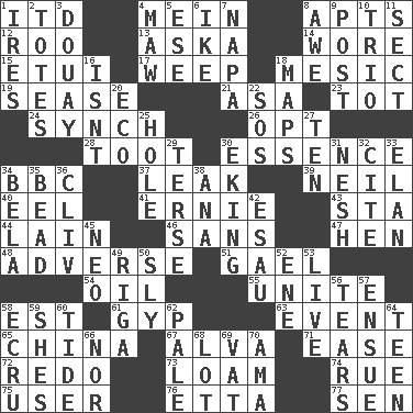 ACROSS 1. It would 4. Chow _ 8. Tenement units (abbr.) 12. Friend of Pooh 13. "____ silly question..." 14. Had on 15. Needle case 17. Shed a tear 18. Of or pertaining to a meson 19. Gospel singer Marvin 21. White ___ sheet 23. Small child 24. Synchronize (abbr.) 26. Elect 28. A blast of a horn 30. Core 34. English channel? 37. Path through which fluid escapes 39. Famous astronaut Armstrong 40. Snakelike fish 41. Bert's buddy 43. R.R. building 44. (Had) reclined 46. Without 47. Layer 48. Contrary to your interests or welfare 51. Highlander 54. Lubricate 55. Join together 58. Eastern Standard Time (abbr.) 61. Con 63. Happening 65. Large country 67. Inventor's middle name 71. Relaxation 72. Redecorate 73. Rich soil 74. Sorrow 75. One who uses or employs something 76. Singer James 77. Elected rep. DOWN 1. Angers 2. Lugs 3. A city in N France, SE of Calais 4. Informal term for the mouth 5. Compass dir. 6. D.D.E's nickname 7. California wine valley 8. Deep reverence 9. Mail 10. Musical group of three 11. Religious group 16. Is not 18. Atlas contents 20. Environmental prefix 22. Distress signal 25. Hollow 27. Nine, plus one 29. Laconic 30. Supplementing with great effort 31. Soft 32. Quote 33. Flair 34. Actor Lugosi 35. Necklace unit 36. 154 in Roman numerals 38. Santa ___, CA 42. Son of Isaac 45. Modern: prefix 49. Capital of Latvia 50. Mischievous 52. Compass dir. 53. Moving, as bait 56. Pulls into pieces 57. Take place subsequently 58. Shade of tan 59. "______ My Girl" (Turtles hit) 60. Event that recurs at intervals 62. Light colored 64. Adolescent 66. And not 68. Car dealer's back yard 69. Large container 70. Wet nurse (var.)