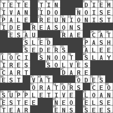 ACROSS 1. False hair 5. Metal container 8. South Vietnam president (1954) 12. "Terrible" tsar 13. Wedding promise 14. Annoying sound 15. Diluted with white 16. One who advocates reunion 19. Binary compound 20. Thinks logically 21. He sold his birthright 23. Actress Charlotte 24. Domesticated feline 27. Downhill vehicle 30. Romantic infatuation 31. Spring feasts 34. Toward shelter 35. Venues 38. Snob 40. Kill 41. Angers 42. Finds the solution 44. Haul 45. Have the gumption 46. Eastern Standard Time (abbr.) 47. Large container 50. Lyric poems 53. Speakers 57. Corporate head (abbr.) 59. Supplying deficiencies 63. Grant temporary use of 64. First name in cosmetics 65. Modern: prefix 66. Otherwise 67. Lacerate 68. Followers of ems 69. Perceives with the eye DOWN 1. Native american tent (variation) 2. Dodge 3. Stories 4. Compass dir. 5. Hoop that covers a wheel 6. It may be bright or harebrained 7. Horse sense 8. Spanish title 9. One more than two 10. Curvy letter 11. Was introduced to 14. Sense of smell 17. Not either 18. _ tizzy (2 wds.) 20. Governing power 22. Aid 24. Give a ring to 25. Toward the sea 26. Those people 28. Begley and Asner 29. Hiding places for outlaws 30. Went by 32. Friend of Pooh 33. Exchanged or delivered for money 35. Louse (plural) 36. Mouths or openings 37. Foregone conclusion 39. Federal power corp. 43. Greek god of love 47. Short-tailed, large-bodied rat 48. "We ___ not amused" (Victoria) 49. Make lace 51. Learning spot: Fr. 52. Gospel singer Marvin 54. Prong on a fork 55. Baking chamber 56. Vintage cars 58. Washington bills 59. Arrange properly for use 60. Purpose 61. Parent Teacher Assoc. 62. For each 63. French article
