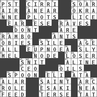 ACROSS 1. Pacific Standard Time (abbr.) 4. High-altitude cloud 9. Fly high 13. Wind 14. Approach 15. Gumbo ingredient 16. Compass dir. 17. Schemes 18. Louse (plural) 19. Ewer handle 21. Compass dir. 22. All-night dance parties 24. Do not 26. "We ___ not amused" (Victoria) 27. Role for Stallone 29. Pismires 30. Off-Broadway awards 31. Drop; flow; fall 33. Personal question 36. 100% 37. Normal relaxed breathing 40. Wily 41. Cartoonist voice _ Blanc 42. Connecting point 43. Failure 45. In a ____ (agitated or irritated) 47. Place in a line 48. Corporate head (abbr.) 49. Lubricates 50. Soup utensil 52. Biblical high priest 54. _ moment's notice (2 wds.) 56. Having or resembling wings 57. Virtuous person 59. Curve 61. Hero or heavy, e.g. 62. 1973 Nobel Price Winner (Physics) Leo 63. Teachers' org. 64. Nourish 65. Laconic 66. Make lace DOWN 1. Baking dish 2. Trig term 3. Excercise machine 4. Head covering 5. An arm off of a larger body of water 6. Vintage cars 7. Assign a rank or rating to 8. Big collection agency 9. Finds the solution 10. Migrant worker of the '30s 11. Curves 12. Actress Charlotte 20. Loose flowing garment 22. The wife of a rajah (variant) 23. Nonscientific branch of learning 25. Olfactory organ 27. Wander 28. Competent 29. _ vera 31. Specific locale 32. Working for oneself (abbr.) 33. Aide 34. Small, secluded valley 35. Jane of fiction 38. The state of being joined or united 39. Mountain range southwest of Kyrgyzstan 44. Rounded earthenware pot or jar 45. Tallied 46. Modern: prefix 49. Pig sounds 50. A type of plum 51. Light colored 52. Relaxation 53. One who doesn't tell the truth 55. Type of rug 56. Sandy's bark 57. Put into a specified state 58. Standoff 60. Feline