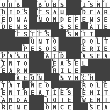 ACROSS 1. Globe 4. Moves up and down 8. Is not 12. "Vaya con ____" 14. Son of Isaac 15. Letter starter 16. Pulitzer Prize-winning author Ferber 17. Unrelated to defense, as in spending 20. Habitations of wild animals 21. Compass dir. 22. Had dinner 23. _____ Park, CO 27. Stricken, poetically 29. To (old English) 31. Stupid person 34. Mexican monetary units 35. One of the Great Lakes 36. Romantic infatuation 39. Assist 41. At sea 42. To the inside or interior of 43. Artist's stand 46. Merit 47. Cause heat under the collar 48. Period of immesurable duration 51. Synchronize (abbr.) 54. Make lace 56. Modern: prefix 58. Hero or heavy, e.g. 61. Pleas 66. Give off 67. Small Philippine buffalo 68. Haul 69. Left 70. French philosopher Descartes 71. Single time 72. Ocean DOWN 1. Wrote a lyric poem 2. Travel on or in a vehicle 3. Child's nurse 4. Benjamin's nick name 5. Bear (Spanish) 6. Bar 7. Soap bubbles 8. Binary compound 9. Elected representatives 10. Political cartoonist Thomas 11. Relationship diagram 13. Backtalk 18. Double-curved letter 19. Opposite of masc. 24. Third day of the wk. 25. Followers of ems 26. Portico 28. Perfect 30. Flexible twig of a willow tree 32. Whopper 33. Afternoon social gathering 34. Give a jingle 36. Sliced dessert 37. Santa ___, CA 38. Ski resort town in Vermont 40. Raised platform 44. Stealthy 45. Car or cant ending 49. Single 50. Teachers' org. 52. Ship's personnel 53. Residences 54. Pull apart 55. Queen of England 1702-14 57. Von Bismarck 59. Actor's bit 60. Singer James 62. Actress Charlotte 63. Electrically charged atom 64. And so on (abbr.) 65. Observe