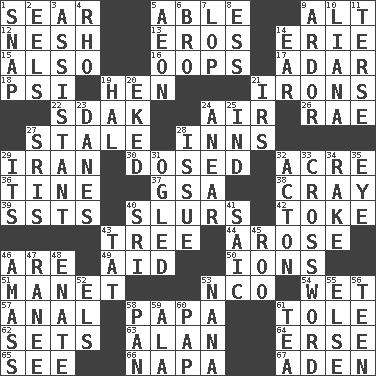 ACROSS 1. Wither 5. Competent 9. The first octave above the treble staff 12. Soft 13. Greek god of love 14. One of the Great Lakes 15. In addition 16. I made a mistake 17. The sixth month of the Jewish calendar 18. 23rd letter of the Greek alphabet 19. Layer 21. Removes the wrinkles 22. Neighbor of Neb. 24. Atmosphere 26. Actress Charlotte 27. Lacking originality or spontaneity 28. Restaurants 29. SW Asia republic 30. Administered medicine 32. 1/640 square mile 36. Prong on a fork 37. Girls' org. (abbr.) 38. Supercomputer manufacturer 39. Fast planes 40. Runs notes together 42. Puff or smoke 43. Woody plant 44. Came up 46. "We ___ not amused" (Victoria) 49. Help 50. Charged particles 51. French painter Edouard 53. Non-commissioned officer (abbr.) 54. Soggy 57. Of or related to the anus 58. Dad 61. Lacquered or enameled metalware 62. Puts into a specified state 63. Actor Alda or Thicke 64. Celtic language 65. Perceive with the eye 66. California wine valley 67. Arabian gulf DOWN 1. Fastener 2. Snakelike fish 3. Aide 4. 17th letter of the Greek alphabet 5. Period of immesurable duration 6. Sis' sibling 7. Chop off 8. Curvy letter 9. Zeal 10. Woody, climbing, usually tropical plant 11. Laconic 14. Ewer handle 19. Actor Linden 20. Made supply last 21. Big collection agency 23. Natives or inhabitants of Denmark 24. Approach 25. Indiana (abbr.) 27. Indian titles of respect 28. Come out of 29. ___ a Wonderful Life 31. Stared 32. NE Massachussets city 33. What you're doing now 34. Libertine 35. Sight organ 40. Indian title of respect (Mr.) 41. Ketch in the Levant 43. Make lace 45. Friend of Pooh 46. Collect or gather 47. The wife of a rajah (variant) 48. Maternal 52. Raised railways 53. Grandmother 55. Otherwise 56. Adolescent 58. Baking dish 59. In the manner of 60. Infant food 61. Beverage made from leaves