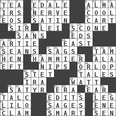 ACROSS 1. Afternoon social gathering 4. Peak District village in England 9. _ mater 13. Big collection agency 14. Boldness 15. Calm and collected 16. Greek goddess of the dawn 17. Smooth fabric 18. Draw slowly or heavily 19. Title for a knight 21. Luau accessory 22. Biscuitlike quick bread 24. Without 26. Begley and Asner 27. Nick name for Arthur 29. Compass direction 30. Seines 31. Settles 33. Scottish cap 36. Layer 37. More overdramatic by comparison 40. According to 41. Newt 42. Pinches, bites 43. Fourth or lowest deck 45. Proofreading order 47. Falsehoods 48. Retirement account (abbr.) 49. Electrical Unit 50. Man with strong sexual desires 52. Epoch 54. Hearing organ 56. Baby powder 57. Proofreads 59. Part of a journey 61. _ and Stitch 62. Gurus 63. Compass dir. 64. Burrowing marine mollusk 65. Don Adams' spy role 66. Elected rep. DOWN 1. Neckwear 2. Greek god of love 3. Aide 4. Followers of ems 5. Allots cards 6. Johnson of "Laugh-In" 7. 57 in ancient Rome 8. Car or cant ending 9. Buttonhole 10. Grant temporary use of 11. Greater amount 12. The first octave above the treble staff 20. Water falling in drops from the sky 22. Gospel singer Marvin 23. Music discs 25. Soft 27. American tennis player Robert 28. Coral collection 29. Armor plate that protects the chest 31. Stricken, poetically 32. Electrical Unit 33. Baron Munchausen's specialties 34. Medicinal plant 35. Atlas contents 38. Approach 39. Round or rotation of duties 44. Assign a rank or rating to 45. "Cheers" or "Ellen" 46. Attempt 49. Wetness 50. Travel by water 51. Silent film actress Nazimova 52. Dutch treat 53. Capital of Latvia 55. French philosopher Descartes 56. Affectionate concern, for short 57. Curvy letter 58. Fast jet (abbr.) 60. Commissioned mil. rank
