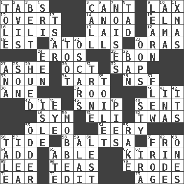 ACROSS 1. Bar bills 5. Patter 9. Not strict 12. Unconcealed 14. Small Philippine buffalo 15. Shade tree 16. Ms. Damita and namesakes 17. Put down 18. Wet nurse (var.) 19. Eastern Standard Time (abbr.) 20. Ringlike coral islands and reefs 23. Mouths or openings 24. Greek god of love 25. Inky black, to poets 27. American tennis player Robert 30. Sep. follower 32. Plant excrement 33. Part of speech 34. Small pie 36. Science/research agcy. 38. One (Scot) 39. Friend of Pooh 40. Cards in a Roman deck? 43. Expire 46. Clip 48. Transmitted 49. Symbol (abbr.) 51. Connecticut Ivy Leaguer 52. It was, poetically 53. Butter sub 54. Suggestive of the supernatural 56. Periodic rise and fall of the sea level 58. Greek mezzo-soprano Agnes 61. Back 64. Say or write further 65. Competent 66. Japanese brewing company 68. Area sheltered from the wind 69. Afternoon social gatherings 70. Eat (away) 71. Hearing organ 72. Prepare for publication 73. Eras DOWN 1. Lacquered or enameled metalware 2. Advice 3. Waist strap 4. Indian title of respect (Mr.) 5. Give a ring to 6. Of or related to the anus 7. Annoying sounds 8. Small amount or degree 9. Acquire or gain knowledge or skills 10. _ mater 11. Dec. holiday 13. Russian ruler of old 21. A blast of a horn 22. Motion picture awards 23. I made a mistake 24. Car or cant ending 26. Forbid 27. Santa ___, CA 28. Male child 29. Became colored 31. Marketplace scale 35. Bathroom 37. Soared 41. _ tizzy (2 wds.) 42. It is 44. Capri or Wight 45. Sight organ 47. Sliced desserts 48. Filthy place 50. Crowded into 53. More peculiar 55. Libertine 56. Falsehood 57. The content of cognition 59. Jai ____ 60. For fear that 61. Tree-dwelling hopper 62. Travel on or in a vehicle 63. Washington bills 65. Had dinner 67. Lyricist Gershwin