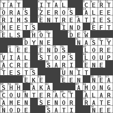 ACROSS 1. Make lace 4. Slanted text style (abbr.) 8. Sure thing 12. Mouths or openings 14. Nothings 16. Toward shelter 17. Basketball hoops 18. Pleas 20. Confronts 22. Working for oneself (abbr.) 23. Newt 24. Raised railways 25. Being at a high temperature 28. Morning condensation 30. Centimeter-gram-second unit of force 31. Thoroughly unpleasant 35. Area sheltered from the wind 37. Conclusions 40. Old wives' tales, e.g. 41. Small bottle 42. Obstructs or blocks passage 44. Central Nebraska county 45. 1/640 square mile 46. Indian skirt 47. Compass dir. 48. Trials 50. A single undivided whole 52. Make supply last 54. Car or cant ending 55. Teachers' org. 58. Quiet! 61. Alias (abbr.) 63. Amid 65. Act in opposition 70. Having or resembling wings 71. So be it 72. Sir (Sp.) 73. Pace 74. Connecting point 75. Suttee (variant) 76. Born DOWN 1. Singer Mel 2. Satellite of Uranus 3. Makes less strong or intense 4. Ending with capital 5. "___ Little Indians" 6. Tate display 7. Australian parrot (variant) 8. Feline 9. Writer Wiesel 10. Coral ridge 11. Trial 13. Fast jet (abbr.) 15. Transmit 19. An important port of Yemen 21. Like a shrinking violet 26. Washington bills 27. Portable shelters 29. Place for singles 30. Keyboard key 32. Within a short period 33. Loyal 34. Slangy assent 35. Louse (plural) 36. Hearing organs 38. ___ good deed 39. Upset 41. Large container 43. Trig term 49. Three-handed card game 51. _ tizzy (2 wds.) 53. Makes supply last 55. Pitcher Ryan 56. Related on the mother's side 57. Match 58. Glance over 59. Like (prefix) 60. Took on color 62. Ancient Greek god of war 64. Make imperfect 66. Compass dir. 67. Santa ___, CA 68. Small bed 69. Three (prefix)