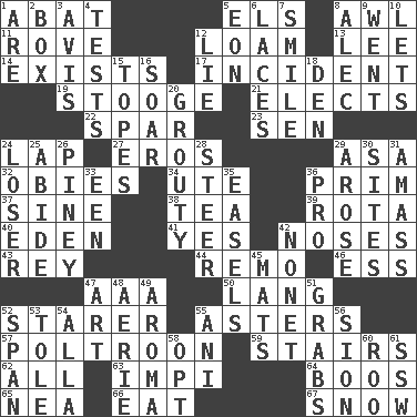 ACROSS 1. Blind as ____ 5. Raised railways 8. Leather borer 11. Be footloose 12. Rich soil 13. Area sheltered from the wind 14. Is extant 17. Happening 19. Moe Howard, for one 21. Chooses 22. Practice fight 23. Elected rep. 24. Pet locale 27. Greek god of love 29. White ___ sheet 32. Off-Broadway awards 34. Shoshoni 36. Demure 37. Trig term 38. Beverage made from leaves 39. Round or rotation of duties 40. Genesis locale 41. Consenting reply 42. Olfactory organs 43. Marina Del _, California 44. San ____ (Riviera town) 46. Curvy letter 47. American Automobile Association (abbr.) 50. Austrian-born American filmmaker Fritz 52. A viewer who gazes fixedly 55. Michaelmas daisies 57. Characterized by complete cowardliness 59. Flight of steps 62. 100% 63. Body of Kaffir warriors 64. Expressions of contempt or scorn 65. Teachers' org. 66. Ingest 67. Frozen precipitation DOWN 1. "We ___ not amused" (Victoria) 2. Gift holder 3. Advice 4. Trials 5. Period of immesurable duration 6. Shoestrings 7. Grin 8. Actor Baldwin 9. Left 10. Allows 12. Whopper 15. Drinks excessively 16. Fly high 18. Lair 20. Sullen 24. Failure 25. Tolerate 26. Abounding in pines 28. Bull 29. Came up 30. Settings 31. Collect or gather 33. Car or cant ending 35. Artist's stands 36. Adept person 42. Music written for nine 45. Floor protectors 47. Tate display 48. Nest on high 49. Scent 51. Catches 52. Connect, as a bridge 53. Lacquered or enameled metalware 54. Silent film actress Nazimova 55. Cuckoo 56. The Jewish people; Israel 58. Choose 60. Friend of Pooh 61. Compass dir.
