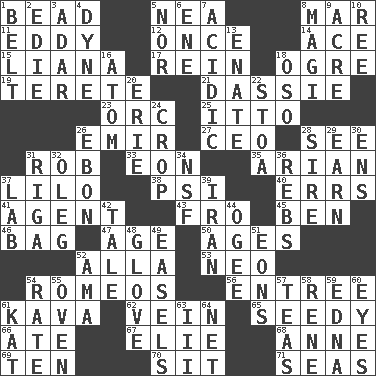 ACROSS 1. Necklace unit 5. Teachers' org. 8. Spoil 11. Whirlpool 12. At one time in the past 14. Adept person 15. Woody, climbing, usually tropical plant 17. It's straight from the horse's mouth 18. Legendary monster 19. Cigar-shaped 21. Hyrax 23. The grampus (Milton) 25. "Tell ____ the Marines!" 26. Arab leader 27. Corporate head (abbr.) 28. Perceive with the eye 31. Director Reiner 33. Period of immesurable duration 35. Believer in; advocate of (suffix) 37. _ and Stitch 38. Air pressure measure (abbr.) 40. Blunders 41. Rep 43. From 45. Benjamin's nick name 46. Container for groceries 47. Personal question 50. Matures 52. Silent film actress Nazimova 53. Modern: prefix 54. Lover boys 56. Main course 61. Polynesian shrub of the pepper family 62. Distinctive style or manner 65. Sleazy 66. Had dinner 67. Writer Wiesel 68. Singer Murray 69. "___ Little Indians" 70. Be seated 71. Oceans DOWN 1. Waist strap 2. Singer Brickell 3. The sixth month of the Jewish calendar 4. Centimeter-gram-second unit of force 5. Not either 6. Compass dir. 7. Being or containing an acid 8. Wise men 9. 1/640 square mile 10. To separate or throw off 13. Related on the mother's side 16. Smallest unit of an element 18. Bear (Spanish) 20. 4th largest of the Great Lakes 22. Portico 24. Riding implement 26. Inky black, to poets 28. Male parent of an animal 29. Merit 30. Followers of ems 31. Capital of Latvia 32. Cassini of fashion 34. Science/research agcy. 36. Confederate soldiers (slang) 37. Experiment locale 39. SW Asia republic 42. Falsehood 44. Double curve, resembling the letter S 48. Michael Jackson trademark 49. Artist's stands 51. Immeasurably long periods of time 52. Wet nurse (var.) 54. Pace 55. Baking chamber 57. Afternoon social gatherings 58. French philosopher Descartes 59. Pulitzer Prize-winning author Ferber 60. Snake ____ (dice throw) 61. Krazy ___ of comics 63. One more than two 64. Remaining after all deductions