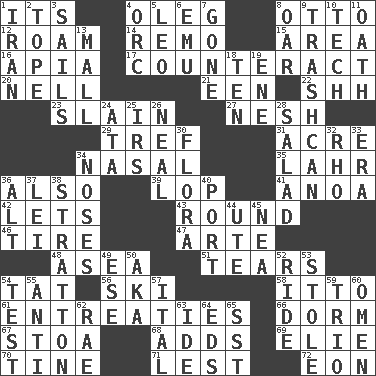 ACROSS 1. ___ a Wonderful Life 4. Cassini of fashion 8. "Beetle Bailey" pooch 12. Wander 14. San ____ (Riviera town) 15. Type of rug 16. Capital of Western Samoa 17. Act in opposition 20. 1994 drama film starring Jodie Foster 21. Car or cant ending 22. Quiet! 23. Killed 27. Soft 29. Unclean, religiously 31. Measure of real estate 34. Relating to the nose 35. Cowardly lion portrayer 36. In addition 39. Chop off 41. Small Philippine buffalo 42. Allows 43. Single shot of ammunition 46. Hoop that covers a wheel 47. Johnson of "Laugh-In" 48. Toward the sea 51. Pulls into pieces 54. Make lace 56. What Jean-Claude Killy likes to do 58. "Tell ____ the Marines!" 61. Pleas 66. Dormintory (informal) 67. Portico 68. Sums up 69. Writer Wiesel 70. Prong on a fork 71. For fear that 72. A really long time DOWN 1. SW Asia republic 2. Drink excessively 3. Moves on water 4. The grampus (Milton) 5. Lion 6. Australian flightless bird 7. Went 8. Boat paddle 9. File 13 10. Technology 11. Pledge 13. Shopping center 18. "___ Little Indians" 19. Compass dir. 24. _ moment's notice (2 wds.) 25. Big collection agency 26. Be tempered by heat 28. Vegetable dish 30. Plants 32. 17th letter of the Greek alphabet 33. Epoch 34. Olfactory organs 36. The first octave above the treble staff 37. Luau accessory 38. Ski resort town in Vermont 40. Left side of a ship or aircraft 44. Shoshoni 45. Teachers' org. 49. Compass dir. 50. Alias (abbr.) 52. Travel on an animal 53. Fur scarf 54. Trial 55. Against 57. Slanted text style (abbr.) 59. Musical group of three 60. Sign of something about to happen 62. Actress Charlotte 63. Binary compound 64. Begley and Asner 65. Fast jet (abbr.)
