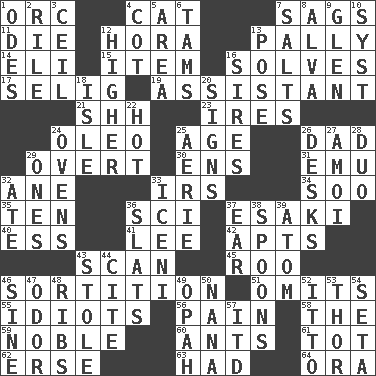 ACROSS 1. The grampus (Milton) 4. Feline 7. Settles 11. Pass on 12. Israeli folk dance 13. Chummy 14. Biblical high priest 15. A whole individual unit 16. Finds the solution 17. Major League Baseball Commissioner Bud 19. Helper 21. Quiet! 23. Angers 24. Margarine 25. Ripen 26. Male parent 29. Unconcealed 30. Followers of ems 31. Australian flightless bird 32. A saturated hydrocarbon 33. Big collection agency 34. "Barney Miller" actor Jack 35. "___ Little Indians" 36. _-fi 37. 1973 Nobel Price Winner (Physics) Leo 40. Double-curved letter 41. Area sheltered from the wind 42. Tenement units (abbr.) 43. Examine minutely or intensely 45. Friend of Pooh 46. Drawing lots 51. Leaves out 55. Foolish or stupid persons 56. Ache 58. Definite Article 59. Having high moral qualities 60. Pismires 61. Small child 62. Celtic language 63. Possessed 64. Mouth or opening DOWN 1. Lyric poems 2. Cause heat under the collar 3. To provide with a ceiling 4. Small bed 5. Type of rug 6. Scottish caps 7. Table seasonings 8. Inventor's middle name 9. Small, secluded valley 10. System (abbr.) 12. Having greater elevation 13. Airs 16. Fathers 18. Capri or Wight 20. Signals 22. Being at a high temperature 24. Baking chambers 25. Nest on high 26. Writing tables 27. Mine, in Marseilles 28. Superhero pair 29. Washington bills 32. Had dinner 33. Ancient Celtic tribe of eastern Britain 36. Narrow boards 37. Ewer handle 38. Soup utensils 39. Tiny particle 43. Fur scarf 44. Quote 46. Trig term 47. Scent 48. Chest bones 49. Brightly colored fish 50. Grandmother 52. "Tell ____ the Marines!" 53. Son of Odin 54. Bristle 57. It would
