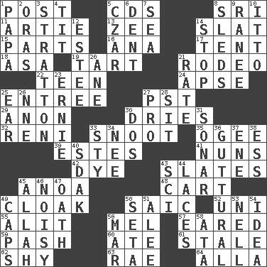 ACROSS 1. Mail 5. Music discs 8. _ Lanka 11. Nick name for Arthur 13. Last letter of the English alphabet 14. Narrow board 15. Components 16. Santa ___, CA 17. Portable shelter 18. White ___ sheet 19. Small pie 21. Cowboy competition 22. Adolescent 24. Domed church section 25. Main course 27. Pacific Standard Time (abbr.) 29. Soon (poet.) 30. Frees from moisture 32. Painter Guido (1575-1642) 33. Snob 35. Double curve, resembling the letter S 39. _____ Park, CO 41. Religious women 42. Color 43. Chalkboards 45. Small Philippine buffalo 48. Draw slowly or heavily 49. Covering 50. Ketch in the Levant 52. Single; one (prefix) 55. Came down and settled, as after flight 56. Cartoonist voice _ Blanc 57. Having ears or earlike features 59. Romantic infatuation 60. Had dinner 61. Showing deterioration from age 62. Like a shrinking violet 63. Actress Charlotte 64. Silent film actress Nazimova DOWN 1. Dad 2. Mouths or openings 3. Ski resort town in Vermont 4. Teat (slang) 5. Russian ruler of old 6. Gouge 7. Ocean 8. Bobsleighs 9. The wife of a rajah (variant) 10. "Tell ____ the Marines!" 12. First name in cosmetics 14. Halt 20. One (Scot) 21. Assign a rank or rating to 23. Bert's buddy 25. Ewer handle 26. Compass dir. 27. Adept person 28. Be seated 30. Two (Sp.) 31. Echolocation 33. Filthy place 34. Born 36. From the throat 37. Compass dir. 38. Curvy letter 40. Neighbor of Neb. 43. _-fi 44. Shoestrings 45. Assad's deity 46. Annoyingly loud 47. Pledge 49. Smile enhancers 50. Bristle 51. Toward shelter 53. 1994 drama film starring Jodie Foster 54. The content of cognition 56. Spoil 58. "One Day ___ Time"