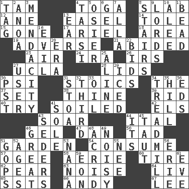 ACROSS 1. Scottish cap 4. Ancient Roman robe 8. Broad, flat, thick piece 12. One (Scot) 13. Artist's stand 14. Lacquered or enameled metalware 15. Went 17. Satellite of Uranus 18. Type of rug 19. Contrary to your interests or welfare 21. Stayed 23. Wind 24. Lyricist Gershwin 26. Big collection agency 27. Southern CA. univ. 28. Hats (slang) 30. Air pressure measure (abbr.) 31. Unemotional ones 34. Definite Article 37. Put into a specified state 38. One or ones belonging to thee 39. To free from 40. Attempt 41. Dirtied 42. Raised railways 43. Fly high 44. Slanted text style (abbr.) 46. Set 47. Daniel's nick name 50. Bit 51. Place where plants grow 54. Eat 57. Double curve, resembling the letter S 58. Nest on high 60. Hoop that covers a wheel 62. Lightbulb-shaped fruit 63. Annoying sound 64. 54 in ancient Rome 65. Fast planes 66. "60 Minutes" Commentator Rooney 67. Area sheltered from the wind DOWN 1. Label 2. Small Philippine buffalo 3. Ananias' fault 4. Tarsus (plural) 5. Flexible twig of a willow tree 6. Unit of force equal to gravity 7. Silent film actress Nazimova 8. Flight of steps 9. Domineers 10. Toward shelter 11. Necklace unit 13. Hearing organ 16. Tending to cause great harm 20. Period 22. Auction offers 25. Place in a line 27. One who makes use of a thing 29. On the rocks 30. Pacific Standard Time (abbr.) 31. Portico 32. One of three equal parts 33. Petroleum 34. Excercise machine 35. Land elevation 36. Begley and Asner 41. Not divided or shared with others 43. Spring feasts 44. ___ a Wonderful Life 45. Pulled tight 46. Relatively large 48. Sour-tasting 49. Annoyingly loud 51. Republicans 52. Eras 53. Nanny 55. Born 56. One of the Great Lakes 59. Period of immesurable duration 61. First lady