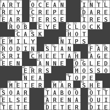 ACROSS 1. Nonscientific branch of learning 4. Sea 9. International (abbr.) 13. Marina Del _, California 14. Streamer paper 15. Have the gumption 16. Ewer handle 17. Laconic 18. Angers 19. Director Reiner 21. Sight organ 22. Timepiece 24. Keg 26. Being at a high temperature 27. Poet Dickinson 29. Pinches, bites 30. "The Thinker" sculptor 31. Comedian Laurel of Laurel & Hardy 33. Distant 36. Indian title of respect (Mr.) 37. Leopard's kin 40. Grow older 41. Car or cant ending 42. Queen of England 1702-14 43. Stared 45. Blunders 47. With motion or animation 48. Teachers' org. 49. Drink excessively 50. Distance measurement 52. Third mo. 54. A female animal or person 56. Fly high 57. Off limits 59. Baseball player Mel 61. Otherwise 62. Sports stadium 63. Fr. "Yes" 64. Wig 65. Prevent from occurring 66. Pass on DOWN 1. "We ___ not amused" (Victoria) 2. Posterior 3. Polypeptide antibiotic 4. Sep. follower 5. Small stream 6. Suggestive of the supernatural 7. Domed church section 8. Born 9. Foolish or stupid persons 10. Drug cop 11. Long journey 12. French article 20. Indonesian resort city 22. Large country 23. Trim (branches) 25. Synchronize (abbr.) 27. Celtic language 28. Greater amount 29. Nathan's nickname 31. Elected reps. 32. Nine, plus one 33. It jiggles the polygraph 34. Eras 35. Redecorate 38. Ethiopian city, capital of Harari 39. Like (prefix) 44. Republicans 45. Main course 46. To sift 49. Heavy duty weighing machine 50. Undercover agent 51. 90 degrees 52. Female horse 53. Collude with 55. Needle holder 56. Arrange properly for use 57. Bit 58. Boat paddle 60. Neckwear