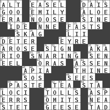 ACROSS 1. The first octave above the treble staff 4. Artist's stand 9. Raised platform 13. Thick or sticky substance 14. Poet Dickinson 15. Medicinal plant 16. Period 17. Trap for birds or small mammals 18. Trig term 19. Binary compound 21. Compass dir. 22. Goes without food and/or water 24. Heroin 26. Cards in a Roman deck? 27. Prevent from occurring 29. Jane of fiction 30. Came up 31. Omen 33. Alias (abbr.) 36. River (Sp.) 37. Catching in a trap 40. Elected rep. 41. Snakelike fish 42. Mouths or openings 43. NE Netherlands city 45. Capital of Western Samoa 47. One or ones belonging to thee 48. Mayday 49. Observes 50. Thick mixture 52. Beverage made from leaves 54. R.R. building 56. Event scenes 57. For Whom the Bell _____ 59. Cleo's killer 61. Blunders 62. Leaves out 63. Teachers' org. 64. Proofreading order 65. Honkers 66. Bit DOWN 1. Mature 2. Australian parrot (variant) 3. Inedible or poisonous agaric 4. Car or cant ending 5. Amid 6. The Jewish people; Israel 7. Otherwise 8. Potassium hydroxide 9. Small ungulate mammals of Africa 10. Came down and settled, as after flight 11. Charged atoms 12. Perceive with the eye 20. Makes supply last 22. Film actor Errol 23. Atmosphere 25. Ancient Greek god of war 27. Have the gumption 28. 4th largest of the Great Lakes 29. The front part of a cuirass 31. "Two Mules for Sister ____" 32. Lyricist Gershwin 33. Helper 34. Peachy ____! 35. Singer Murray 38. Annoying sound 39. Yard entry 44. "______ My Girl" (Turtles hit) 45. Aid 46. Cooking vessel 49. Table seasonings 50. Sweet dark-red dessert wine 51. 1/640 square mile 52. Heavy book 53. Writer Wiesel 55. At sea 56. French article 57. Coat; cloak 58. Compass dir. 60. Writing tablet