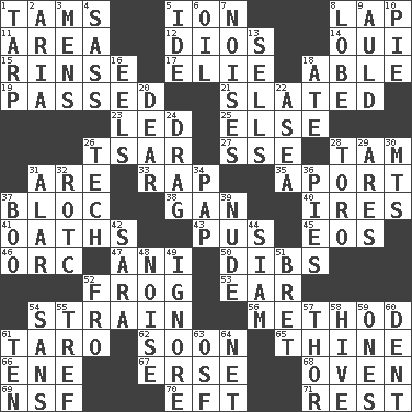 ACROSS 1. Scottish caps 5. Electrically charged atom 8. Pet locale 11. Type of rug 12. "Vaya con ____" 14. Fr. "Yes" 15. Remove soap 17. Writer Wiesel 18. Competent 19. Went by 21. Scheduled 23. Directed 25. Otherwise 26. Russian ruler of old 27. Compass dir. 28. Scottish cap 31. "We ___ not amused" (Victoria) 33. Strike 35. To the left, to Queeg 37. Coalition 38. Separate the seeds from cotton 40. Angers 41. Expletives 43. Product of festering 45. Greek goddess of the dawn 46. The grampus (Milton) 47. Black tropical American cuckoo 50. Claim 52. Tree-dwelling hopper 53. Ewer handle 54. Put through a sieve 56. Mode 61. Edible starchy tuberous root 62. Within a short period 65. One or ones belonging to thee 66. Compass dir. 67. Celtic language 68. Baking chamber 69. Science/research agcy. 70. Newt 71. Remainder DOWN 1. Canvas cover 2. Roberta Peters solo 3. Not women's 4. Backtalk 5. Binary compound 6. Lubricate 7. Annoying sounds 8. Ear part 9. Old (Scot.) 10. Sliced dessert 13. Exchanges for money 16. Snakelike fish 18. Had dinner 20. Letter starter 22. At sea 24. To draw with force 26. Technician 28. "Corrida" creature 29. Ancient Greek god of war 30. Mountains (abbr.) 31. Having or resembling wings 32. College mil. group 34. Infant food 36. Sliced desserts 37. Surprise greeting 39. Naked 42. "Two Mules for Sister ____" 44. Thailand, formerly 48. Annoying sound 49. Refuse to acknowledge 51. Cy Young winner Saberhagen 52. Away 54. Without 55. Unclean, religiously 57. Son of Odin 58. Hub of activity 59. Washington bills 60. Gouge 61. Nine, plus one 63. Order of Saint Francis (abbr.) 64. Fish or hair follower