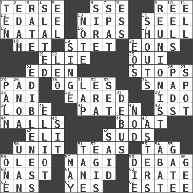 ACROSS 1. Laconic 6. Compass dir. 9. To sift 12. Peak District village in England 13. Cuts off 14. Stitch closed the eyes of (a falcon) 15. Relating to or accompanying birth 16. Mouths or openings 17. Frame or body of a ship 18. Was introduced to 19. Proofreading order 20. Immeasurably long periods of time 21. Writer Wiesel 23. Fr. "Yes" 24. Genesis locale 25. Halts 28. Groovy apt. 30. Stares at amorously 34. Fastener 35. Black tropical American cuckoo 36. Having ears or earlike features 38. Wedding promise 39. Ear part 41. Eucharist need 43. Fast jet (abbr.) 44. Promenades 46. Water vessel 48. Connecticut Ivy Leaguer 49. Soap bubbles 50. A single undivided whole 51. Afternoon social gatherings 53. Label 56. Butter sub 57. Wise men 58. Debunk (Brit. slang) 60. Political cartoonist Thomas 61. Among 62. Feeling or showing extreme anger 63. Followers of ems 64. It is so 65. First name in cosmetics DOWN 1. Nine, plus one 2. Dutch treat 3. Assign a rank or rating to 4. Scheduled 5. Snakelike fish 6. The founder of a family 7. Argument over a trivial matter 8. Curvy letter 9. One who advocates reunion 10. Snakelike fish 11. Pipe bend 13. Make mention of 14. Yells 19. Scorch 20. Greek goddess of the dawn 22. Lion 24. The property of being fit to eat 26. Groovy apts. 27. Specific locale 28. Inside of hand 29. Small Philippine buffalo 31. Pet locale 32. Epoch 33. Put into a specified state 37. Alight from a bus 40. American author Paul (1891-1958) 42. Lower and raise head in agreement 45. Be seated 47. Michaelmas daisies 49. Alleged 50. Uhlan (variant) 51. Docile 52. Armor plate that protects the chest 54. Blind as ____ 55. Yard entry 56. Single 57. Fifth month 58. Pass on 59. Turn to the right