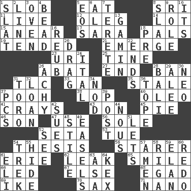 ACROSS 1. Oscar Madison type 5. Consume 8. Indian title of respect (Mr.) 11. Moving, as bait 12. Cassini of fashion 14. Car dealer's back yard 15. Approach 17. "Two Mules for Sister ____" 18. Friends 19. Looked after 21. Develop 23. RI univ. 25. Prong on a fork 26. Blind as ____ 27. Conclude 28. Forbid 31. Affectionate concern, for short 33. Separate the seeds from cotton 35. Lacking originality or spontaneity 37. "Silly old bear" 38. Trim (branches) 40. Margarine 41. Trading vessels 43. Spanish title 45. Sliced dessert 46. Manchild 47. Purpose 50. Flatfish 52. Stalk of a moss capsule 53. Third day of the wk. 54. College paper 56. A viewer who gazes fixedly 61. 4th largest of the Great Lakes 62. Path through which fluid escapes 65. Grin 66. Directed 67. Otherwise 68. Mild oath 69. Mamie's mate 70. Saxophone 71. Billionth: prefix DOWN 1. Narrow board 2. Actor's bit 3. Baking chamber 4. Necklace unit 5. Greek goddess of the dawn 6. Chicken ___ king 7. Cylindrical with tapered ends 8. Volcanic refuse 9. Hero or heavy, e.g. 10. It is 13. Street urchin 16. Reuben's nickname 18. Before (prefix) 20. To be drawn or hauled along 22. Conclusions 24. Slanted text style (abbr.) 26. Painful 28. Indonesian resort city 29. Toward shelter 30. Modern: prefix 31. "Corrida" creature 32. Grant temporary use of 34. Lower and raise head in agreement 36. Drink excessively 37. Personal Computers (abbr.) 39. Mail 42. Institutes legal proceedings 44. Good sense 48. Vertical member of a panel or frame 49. Artist's stands 51. Allows 52. Perceive with the eye 54. Long journey 55. Flintstone garb 57. So be it 58. Capital of Latvia 59. Flair 60. Do over again 61. Connecticut Ivy Leaguer 63. White ___ sheet 64. A weed