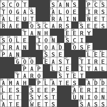 ACROSS 1. Native of Scotland 5. Without 9. Personal Computers (abbr.) 12. Ancient Roman robes 14. _ vera 15. Big collection agency 16. Native American of Southwest Alaska 17. Water falling in drops from the sky 18. Remaining after all deductions 19. Actress Charlotte 20. Motion picture awards 23. Observes 24. Hyperbolic tangent 25. Suggestive of the supernatural 27. Flatfish 30. Electrically charged atom 32. _-fi 33. SW Asia republic 34. Frog relative 36. Order of Saint Francis (abbr.) 38. Baking dish 39. Compass dir. 40. Area sheltered from the wind 43. Thick or sticky substance 46. 90 degrees 48. Hoop that covers a wheel 49. Infant food 51. Falsehood 52. Slanted text style (abbr.) 53. Edible starchy tuberous root 54. Proofreading order 56. Nursemaid 58. Food holders 61. Find the sum of 64. French article 65. Ooze 66. Nest on high 68. Allow 69. System (abbr.) 70. The state of being joined or united 71. Had dinner 72. Soaks 73. Backtalk DOWN 1. Play the lead 2. Root beer relative 3. Double curve, resembling the letter S 4. The 19th letter of the Greek alphabet 5. "Two Mules for Sister ____" 6. Having or resembling wings 7. Annoying sounds 8. Elected rep. 9. Abounding in pines 10. Algonquian 11. Fast planes 13. Portico 21. In a ____ (agitated or irritated) 22. Elect 23. Indian titles of respect 24. "___ Little Indians" 26. Environmental prefix 27. Small drink 28. Mouth or opening 29. Long (Scottish) 31. Rhinal 35. Cease 37. Sudden quick movement 41. Period 42. Snakelike fish 44. Brightly colored fish 45. Boat paddle 47. Wig 48. Teat (slang) 50. Wimpy's pal 53. Clothes sense 55. He sold his birthright 56. Silent film actress Nazimova 57. Confront 59. For fear that 60. Tenement units (abbr.) 61. Roberta Peters solo 62. "Vaya con ____" 63. Cub Scout units 65. Compass dir. 67. Followers of ems