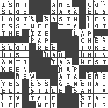 ACROSS 1. Is not 5. One (Scot) 8. Police officer (slang) 11. _ gin 12. "Two Mules for Sister ____" 14. Raised railways 15. Plunders 17. Indian antelope 18. French article 19. Substance 21. Afternoon social gathering 22. Car dealer's back yard 23. Definite Article 24. Ending with capital 25. Pet locale 27. Infant food 28. "Mermaids" star 31. Narrow opening 35. To separate or throw off 37. Casino tip 38. Food container 39. June honoree 41. Washington bills 42. Opposed to 43. Label 45. A home for chicks 46. Peachy ____! 47. Atlas unit 49. ___ Haven, CT 51. _ moment's notice (2 wds.) 52. Followers of ems 55. Affirmative reply 57. Double-curved letter 60. Commissioned military rank 62. Biblical high priest 63. Vertical member of a panel or frame 65. Before Barbara or Clara 66. 54 in ancient Rome 67. Falsehood 68. Thailand, formerly 69. Area sheltered from the wind 70. Fish or hair follower 71. Snakelike fish DOWN 1. Small island 2. Agitate, as a liquid 3. Trap for birds or small mammals 4. Wig 5. White ___ sheet 6. Political cartoonist Thomas 7. 4th largest of the Great Lakes 8. Portable communications device 9. Butter sub 10. Inconspicuous attention getter 13. Of or related to the anus 16. Clip 17. Oozed 20. Russian ruler of old 26. NE Massachussets city 29. Makes supply last 30. State of inaction 31. Neighbor of Neb. 32. Actor's bit 33. Clearly or manifestly demonstrative 34. One or ones belonging to thee 36. Consume 40. Break 44. Yard entry 48. Zero-star reviews 50. Compass direction 52. Bert's buddy 53. Brizilian seaport 54. Shuts with force 55. Shout 56. Writer Wiesel 58. Comedian Laurel of Laurel & Hardy 59. Drop; flow; fall 61. Relaxation 64. Allow