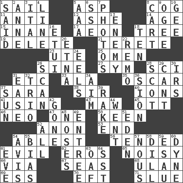 ACROSS 1. Move on water 5. Viper 8. Gear tooth 11. Opposed to 12. American tennis player Robert 14. Ripen 15. Empty; void 17. Period of immesurable duration 18. Relationship diagram 19. Keyboard key 21. Cigar-shaped 23. Shoshoni 25. Presage 26. Trig term 27. Symbol (abbr.) 28. _-fi 31. And so on (abbr.) 33. According to 35. Motion picture award 37. "Two Mules for Sister ____" 38. Title for a knight 40. Charged particles 41. Exploiting 43. Opening into something insatiable 45. Baseball player Mel 46. Modern: prefix 47. Single 50. Peachy ____! 52. At once, immediately (arch.) 53. Conclude 54. Most capable 56. Watched over 61. Morally bad or wrong 62. Greek god of love 65. Annoyingly loud 66. By way of 67. Oceans 68. Uhlan (variant) 69. Double-curved letter 70. Newt 71. Turn sharply DOWN 1. Expressed in words 2. Singer Murray 3. Slanted text style (abbr.) 4. Actor's bit 5. American Automobile Association (abbr.) 6. Compass dir. 7. Pictures 8. Draw slowly or heavily 9. Double curve, resembling the letter S 10. Turn to the right 13. Foe 16. Needle holder 18. Nine, plus one 20. Inactive volcano in Sicily 22. San ____ (Riviera town) 24. Snakelike fish 26. Examine minutely or intensely 28. Highlander 29. Patter 30. Big collection agency 31. Relaxation 32. Musical group of three 34. Direct toward a target or goal 36. The Jewish people; Israel 37. Player for Phoenix 39. Libertine 42. Went 44. Gone 48. Olfactory organs 49. Main course 51. Paradise 52. Everything 54. Opinion 55. Prejudice 57. Common sense 58. Deli pickle 59. Son of Isaac 60. Centimeter-gram-second unit of force 61. First lady 63. Clumsy lout 64. Fast jet (abbr.)