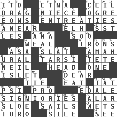 ACROSS 1. It would 4. Inactive volcano in Sicily 8. To provide with a ceiling 12. To be drawn or hauled along 14. Sibling's daughter 16. Legendary monster 17. Immeasurably long periods of time 18. Pleas 20. Approach 22. Shade tree 23. Fast jet (abbr.) 24. French article 25. Nanny (var.) 28. "Barney Miller" actor Jack 30. Welt 31. Removes the wrinkles 35. White ___ sheet 37. Narrow board 40. Housemaid 41. Mountain range 42. Tarsus (plural) 44. Wig 45. Famous astronaut Armstrong 46. Froth on beer 47. Single 48. Small island 50. Letter starter 52. Standoff 54. Erode 55. Make lace 58. 23rd letter of the Greek alphabet 61. Adept person 63. Peak District village in England 65. Seigniories (variant) 70. Having or resembling wings 71. _ gin 72. Travels by water 73. Soaks 74. "Corrida" creature 75. Filth; sediment 76. Observe DOWN 1. Standard of perfection 2. Heavy duty weighing machine 3. Natives or inhabitants of Denmark 4. Compass dir. 5. Metal container 6. Fish or hair follower 7. 43,560 square feet 8. Small bed 9. Armor plate that protects the chest 10. Angers 11. For fear that 13. Girls' org. (abbr.) 15. Snakelike fish 19. Mine, in Marseilles 21. Actress Charlotte 26. Vertical spar for supporting sails 27. Assad's deity 29. Speaker 30. Place for singles 32. Sign of something about to happen 33. Nathan's nickname 34. A female animal or person 35. Ancient Greek god of war 36. Travel by water 38. "We ___ not amused" (Victoria) 39. Sadhe (variant) 41. Single; one (prefix) 43. The content of cognition 49. Native american tent (variation) 51. Had dinner 53. Greek god of love 55. Stories 56. Having winglike extensions 57. Laconic 58. Inconspicuous attention getter 59. Grain storage tower 60. Russian composer Stravinsky 62. Mouths or openings 64. Obsolete 66. Modern: prefix 67. One more than two 68. Pipe bend 69. Compass dir.