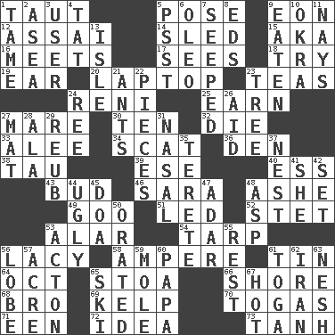 ACROSS 1. Strained 5. Airs 9. Period of immesurable duration 12. Slender Brazilian palm 14. Downhill vehicle 15. Alias (abbr.) 16. Confronts 17. Perceives with the eye 18. Attempt 19. Ewer handle 20. Portable computer 23. Afternoon social gatherings 24. Painter Guido (1575-1642) 25. Merit 27. Female horse 30. "___ Little Indians" 32. Pass on 33. Toward shelter 34. Jazz singing style 36. Lair 38. The 19th letter of the Greek alphabet 39. Compass dir. 40. Curvy letter 43. Partially opened flower 46. "Two Mules for Sister ____" 48. American tennis player Robert 49. Thick or sticky substance 51. Directed 52. Proofreading order 53. Having or resembling wings 54. Canvas cover 56. Made of lace 58. Electrical Unit 61. Metal container 64. Sep. follower 65. Portico 66. Dinah or Pauly 68. Sis' sibling 69. Seaweed 70. Ancient Roman robes 71. Car or cant ending 72. The main thing one is thinking about 73. Hyperbolic tangent DOWN 1. Docile 2. At sea 3. One who uses or employs something 4. Make lace 5. Inconspicuous attention getter 6. Margarine 7. Oozed 8. Begley and Asner 9. Consumed 10. Gumbo ingredient 11. Negative votes 13. Small island 21. Pismires 22. Components 23. Woody plant 24. To riddle 26. Assist 27. Floor protector 28. Wing 29. Reuben's nickname 31. Rhinal 35. Cylindrical with tapered ends 37. A home for chicks 41. A female animal or person 42. Put into a specified state 44. Unsightly 45. ___ good deed 47. The sixth month of the Jewish calendar 48. Cleo's killer 50. Spoke pompously 53. Gambison 55. Take ten 56. Ear part 57. Measure of real estate 59. Undercover agent 60. Dad 61. Ancient Roman robe 62. SW Asia republic 63. Delicate 65. What Jean-Claude Killy likes to do 67. Being at a high temperature