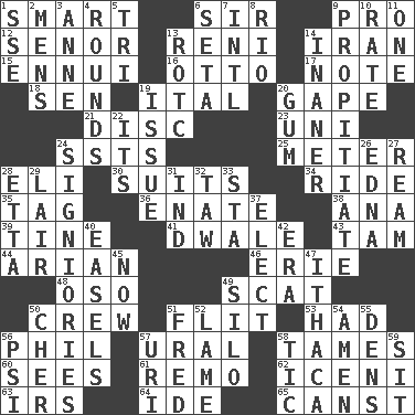 ACROSS 1. Don Adams' spy role 6. Title for a knight 9. Adept person 12. Sir (Sp.) 13. Painter Guido (1575-1642) 14. SW Asia republic 15. World-weariness 16. Von Bismarck 17. Make mention of 18. Elected rep. 19. Slanted text style (abbr.) 20. Stare wonderingly 21. Flat circle 23. Single; one (prefix) 24. Fast planes 25. Distance measurement 28. Connecticut Ivy Leaguer 30. Sets or collections 34. Travel on or in a vehicle 35. Label 36. Related on the mother's side 38. Santa ___, CA 39. Prong on a fork 41. A sleeping potion; an opiate (poet.) 43. Scottish cap 44. Believer in; advocate of (suffix) 46. 4th largest of the Great Lakes 48. Bear (Spanish) 49. Get outta here! 50. Group working together 51. Sudden quick movement 53. Possessed 56. Silvers or Donahue 57. Mountain range 58. Corrects by punishment or discipline 60. Perceives with the eye 61. San ____ (Riviera town) 62. Ancient Celtic tribe of eastern Britain 63. Big collection agency 64. Binary compound 65. 2nd pers. sing. pres. of can (arch.) DOWN 1. Compass dir. 2. Not women's 3. Queen of England 1702-14 4. Periods in a boxing match 5. Three (prefix) 6. Bristle 7. International (abbr.) 8. River (Sp.) 9. Appease 10. Assign a rank or rating to 11. Single 13. College mil. group 14. More lacking in sense or substance 19. Come out of 20. Chewing product 22. It is 24. Seigniories (variant) 26. Pulitzer Prize-winning author Ferber 27. 480, 500 or 516 sheets of paper 28. Singer James 29. Den 31. Working for oneself (abbr.) 32. The 23rd letter of the Hebrew alphabet 33. R.R. building 37. Voters do this 40. Artist's stands 42. Epoch 45. At this time 47. New York city 49. Grain storage tower 50. "Mermaids" star 51. Flintstone 52. Unable to walk 54. So be it 55. Cub Scout units 56. 23rd letter of the Greek alphabet 57. RI univ. 58. Nervous spasm 59. Be seated