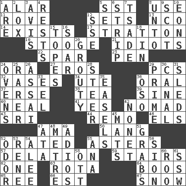 ACROSS 1. Having or resembling wings 5. Fast jet (abbr.) 8. Purpose 11. Be footloose 12. Puts into a specified state 13. Non-commissioned officer (abbr.) 14. Has an existence 17. Ski resort town in Vermont 19. Moe Howard, for one 21. Foolish or stupid persons 22. Coast Guard woman 23. Fenced enclosure 24. Mouth or opening 27. Greek god of love 29. Personal Computers (abbr.) 32. Flower holders 34. Shoshoni 36. Spoken 37. Celtic language 38. Beverage made from leaves 39. Trig term 40. Actress Patricia 41. Consenting reply 42. Wanderer 43. Indian title of respect (Mr.) 44. San ____ (Riviera town) 46. Raised railways 47. Nanny (var.) 50. Long (Scottish) 52. Spoke pompously 55. Michaelmas daisies 57. Accusation by an informer 59. Flight of steps 62. Single 63. Round or rotation of duties 64. Expressions of contempt or scorn 65. To separate or throw off 66. Eastern Standard Time (abbr.) 67. Overwhelm DOWN 1. "We ___ not amused" (Victoria) 2. Brine-cured salmon 3. Advice 4. Musical pauses 5. Arrange properly for use 6. Empty completely 7. Sadhe (variant) 8. To (old English) 9. Native of Scotland 10. Immeasurably long periods of time 12. Compass dir. 15. Drinks excessively 16. Fly high 18. Shallow baking pan 20. Sulky 24. Baking chambers 25. More uncommon 26. Slender Brazilian palm 28. Navigate 29. A-one 30. Lessep's creation 31. Bobsleighs 33. Snakelike fish 35. Artist's stands 36. Bear (Spanish) 42. Music written for nine 45. Floor protectors 47. _ moment's notice (2 wds.) 48. Distance measurement (Brit.) 49. Goodbye (Sp.) 51. Catches 52. Aroma 53. French philosopher Descartes 54. Toward shelter 55. Santa ___, CA 56. The Jewish people; Israel 58. Baseball player Mel 60. Friend of Pooh 61. Compass dir.