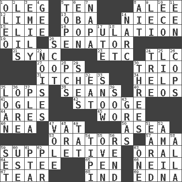 ACROSS 1. Cassini of fashion 5. Nine, plus one 8. Toward shelter 12. Citrus frut 13. Chief or king in Benin or Nigeria 14. Sibling's daughter 15. Writer Wiesel 16. Census information 19. Petroleum 20. Elected representative 21. Synchronize (abbr.) 23. And so on (abbr.) 24. Affectionate concern, for short 27. I made a mistake 30. Musical group of three 31. Skin irritations 34. Assist 35. Chops off 38. Seines 40. Vintage cars 41. Stare 42. Moe Howard, for one 44. Ancient Greek god of war 45. Had on 46. Teachers' org. 47. Large container 50. Toward the sea 53. Speakers 57. Nanny (var.) 59. Supplying deficiencies 63. Spoken 64. First name in cosmetics 65. Writing instrument 66. Famous astronaut Armstrong 67. Pull into pieces 68. Indiana (abbr.) 69. Pulitzer Prize-winning author Ferber DOWN 1. Butter sub 2. Ms. Damita and namesakes 3. Poet Dickinson 4. Turn to the right 5. Drink excessively 6. Inky black, to poets 7. California wine valley 8. Small island 9. Flowery wreath 10. Environmental prefix 11. Car or cant ending 14. Drug cop 17. Shoshoni 18. Car dealer's back yard 20. Native of Scotland 22. Annoying sounds 24. Family _ (genealogy) 25. _ and Stitch 26. 911 reaches them 28. Personal Computers (abbr.) 29. "______ My Girl" (Turtles hit) 30. Triads 32. Consume 33. Frozen precipitation 35. Grant temporary use of 36. Legendary monster 37. Entreaty 39. "Barney Miller" actor Jack 43. Pate de foie ____ 47. Grand slam 48. "We ___ not amused" (Victoria) 49. Make lace 51. Having ears or earlike features 52. At full speed 54. Native american tent (variation) 55. Baking chamber 56. Tear apart 58. Silent film actress Nazimova 59. Put into a specified state 60. Purpose 61. Parent Teacher Assoc. 62. For each 63. Single