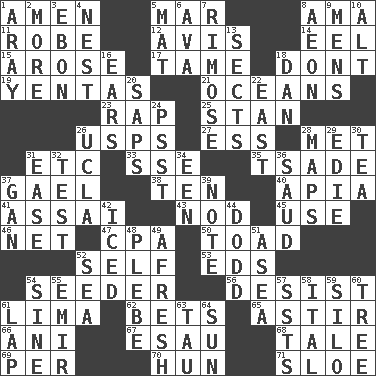 ACROSS 1. So be it 5. Third mo. 8. Nursemaid (var.) 11. Loose flowing garment 12. Deliberation 14. Snakelike fish 15. Came up 17. Docile 18. Do not 19. Gossips 21. Seas 23. Reproach for some lapse or misdeed 25. Comedian Laurel of Laurel & Hardy 26. United States Postal Service (abbr.) 27. Double-curved letter 28. Was introduced to 31. And so on (abbr.) 33. Compass dir. 35. Sadhe (variant) 37. Highlander 38. Nine, plus one 40. Capital of Western Samoa 41. Slender Brazilian palm 43. Allow head to fall sleepily 45. Purpose 46. Remaining after all deductions 47. Tax preparer (abbr.) 50. Frog relative 52. Oneself 53. Begley and Asner 54. Sowing specialist 56. Cease 61. Pale green bean 62. Stakes 65. Moving about 66. Black tropical American cuckoo 67. Son of Isaac 68. Lie 69. For each 70. Attila the _ 71. _ gin DOWN 1. Like ___ of sunshine 2. Greater amount 3. Inky black, to poets 4. Egg locale 5. Floor protector 6. Actress Gardner 7. Full of chinks, cracks, or crevices 8. A really long time 9. Not women's 10. Keyboard modifier key 13. Religious groups 16. Hearing organs 18. Daniel's nick name 20. Plant excrements 22. 90 degrees 24. Inconspicuous attention getter 26. Southern CA. univ. 28. Atlas contents 29. Singer Brickell 30. Afternoon social gathering 31. Relaxation 32. Trial 34. Car or cant ending 36. Saudi Arabian king (1953-1964) 37. Separate the seeds from cotton 39. Make mention of 42. On the rocks 44. Texas town _ City 48. First-year military academy student 49. Anew 51. Toward the sea 52. Ocean 54. Trig term 55. Independent ruler or chieftain 57. Fast planes 58. Slanted text style (abbr.) 59. Grain storage tower 60. Relationship diagram 61. Infant locale 63. The 19th letter of the Greek alphabet 64. Player for Phoenix