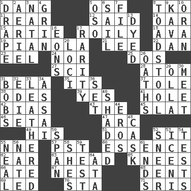 ACROSS 1. Mild oath, euphamism for damn 5. Order of Saint Francis (abbr.) 8. Ring climax 11. Posterior 12. Expressed in words 14. Rowing implement 15. Nick name for Arthur 17. Turbulent 18. Actress Gardner 19. Player piano 21. Area sheltered from the wind 22. One of the 12 tribes of Israel 23. Snakelike fish 24. Not either 25. Two (Sp.) 27. _-fi 28. Smallest unit of an element 31. Actor Lugosi 35. It is 37. Lacquered or enameled metalware 38. Lyric poems 39. It is so 41. Hollow 42. Prejudice 43. Definite Article 45. Narrow board 46. Bristle 47. Curve 49. Part of HMS, perhaps 51. ___ good deed 52. Be seated 55. Compass dir. 57. Pacific Standard Time (abbr.) 60. Core 62. Ewer handle 63. At or in the front 65. Leg joints 66. Had dinner 67. Egg locale 68. Gouge 69. Directed 70. R.R. building 71. Indian titles of respect DOWN 1. Window treatment 2. Nest on high 3. Brizilian seaport 4. Smile widely 5. Bear (Spanish) 6. Travel by water 7. Do some clerical work 8. Inedible or poisonous agaric 9. Polynesian shrub of the pepper family 10. Northwest Algerian city 13. Colored 16. Immeasurably long periods of time 17. Noteworthy scarcity 20. Venues 26. Profane or obscene expressions 29. Water jar 30. Rendezvous 31. Moves up and down 32. Singer Brickell 33. Resembling or made to resemble leather 34. Slender Brazilian palm 36. Arrange properly for use 40. Cast a shadow over 44. Greek god of love 48. Keg 50. Connect, as a bridge 52. Scornful expression 53. Ancient Celtic tribe of eastern Britain 54. Trials 55. Actress Patricia 56. Nathan's nickname 58. "______ My Girl" (Turtles hit) 59. Trial 61. Extremities 64. _ moment's notice (2 wds.)