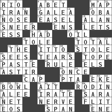 ACROSS 1. _ de Janeiro 4. Collude with 8. Atlas unit 11. SW Asia republic 13. An organ shaped like a helmet 15. Chief or king in Benin or Nigeria 16. Characteristic smell of wine 17. Artist's stand 18. ____ Jay Lerner 19. Scornful expression 21. Followers of ems 22. Allows 23. Double-curved letter 24. Possessed 27. Petroleum 29. Lacquered or enameled metalware 30. Add up to 34. Definite Article 36. "Tell ____ the Marines!" 39. Took without asking 40. Observes 41. Pulls apart 43. Drink excessively 44. Thick mixture 46. Court order 47. Raised railways 48. Moving about 49. At one time in the past 51. Head covering 53. Parent Teacher Assoc. 54. Supplement with great effort 57. Soup holder 60. Small island 63. "The Thinker" sculptor 65. Toward shelter 66. Feeling or showing extreme anger 69. "Two Mules for Sister ____" 70. Remaining after all deductions 71. Boldness 72. Sudden quick movement 73. Greek goddess of the dawn 74. Connect, as a bridge 75. Compass dir. DOWN 1. Remove soap 2. Metal shackles 3. Fertile tracts in a desert 4. Ripen 5. Sound made by sheep 6. Otherwise 7. Adolescent 8. Undercover agent 9. Blind as ____ 10. Baking dishes 12. Born 14. In addition 18. One to whom something is allotted 20. 17th letter of the Greek alphabet 25. Set down 26. Prevent from occurring 28. ___ a Wonderful Life 29. A testis 31. Implement 32. High mountains 33. Area sheltered from the wind 34. Afternoon social gatherings 35. Command 37. The 19th letter of the Greek alphabet 38. Fourth or lowest deck 40. Health resort 42. Posted 45. Period 50. 4-wheeled motor vehicle 52. Ache 54. Peak District village in England 55. Japanese brewing company 56. Maternal 57. Object of repulsion 58. Butter sub 59. Soaks 61. Angers 62. Canvas cover 64. Order of Saint Francis (abbr.) 67. Federal power corp. 68. Car or cant ending
