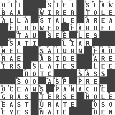 ACROSS 1. Baseball player Mel 4. Proofreading order 8. Cole _ (cabbage dish) 12. Sound made by sheep 13. One who wires 14. Lacquered or enameled metalware 15. Silent film actress Nazimova 17. Lacking originality or spontaneity 18. Type of rug 19. Turned at an angle; bent 21. Burden 23. The 19th letter of the Greek alphabet 24. Observe 26. French article 27. Suttee (variant) 28. One who doesn't tell the truth 30. Cartoonist voice _ Blanc 31. Titan orbits this 34. At a great distance 37. Actress Charlotte 38. Stay 39. "We ___ not amused" (Victoria) 40. Big collection agency 41. Chalkboards 42. Area sheltered from the wind 43. College mil. group 44. Backtalk 46. "Barney Miller" actor Jack 47. Viper 50. Before (prefix) 51. Seas 54. Flamboyance 57. Pate de foie ____ 58. Laconic 60. Hollow 62. Compass direction 63. A salt of uric acid 64. Bear (Spanish) 65. Snake ____ (dice throw) 66. Nathan's nickname 67. Lair DOWN 1. Chief or king in Benin or Nigeria 2. Story 3. Baron Munchausen's specialties 4. Settings 5. Barter 6. Snakelike fish 7. Not kosher 8. A viewer who gazes fixedly 9. Nobles 10. Toward shelter 11. Welt 13. Compass dir. 16. Blind as ____ 20. Fr. "Yes" 22. Actor Alda or Thicke 25. Evade 27. Burn superficially 29. Angers 30. Medical imaging device (abbr.) 31. Table seasoning 32. Phillipine bananalike plant 33. Teat (slang) 34. It jiggles the polygraph 35. Ancient Greek god of war 36. To separate or throw off 41. Within a short period 43. Ridicules or criticizes harshly 44. Health resort 45. Bowlike part 46. Gospel singer Marvin 48. Small fatty European fish 49. Thick mixture 51. Double curve, resembling the letter S 52. Supercomputer manufacturer 53. Surprise greatly 55. Born 56. Otherwise 59. Period 61. Period of immesurable duration