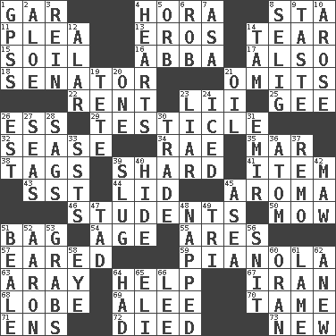 ACROSS 1. Slender fish 4. Israeli folk dance 8. R.R. building 11. Entreaty 13. Greek god of love 14. Rend 15. Land 16. Swedish rock group 17. In addition 18. Legislator 21. Leaves out 22. Monthly bill 23. Cards in a Roman deck? 25. Unit of force equal to gravity 26. Double-curved letter 29. A testis 32. Gospel singer Marvin 34. Actress Charlotte 35. Spoil 38. Labels 39. Pottery fragment 41. A distinct part 43. Fast jet (abbr.) 44. Hat (slang) 45. Scent 46. SAT takers 50. Cut the grass 51. Paper or plastic container 54. Ripen 55. Ancient Greek god of war 57. Having ears or earlike features 59. Player piano 63. Like ___ of sunshine 64. Assist 67. SW Asia republic 68. Ear part 69. Toward shelter 70. Not wild 71. Followers of ems 72. Passed on 73. ___ Haven, CT DOWN 1. Global Positioning Systems (abbr.) 2. _ vera 3. It's straight from the horse's mouth 4. Centers 5. Globe 6. Director Reiner 7. White ___ sheet 8. Former Milwaukee Brewers owner Bud 9. Clothes sense 10. Came up 12. Having or resembling wings 14. Scottish cap 19. Wig 20. Single 21. Lubricate 23. One who doesn't tell the truth 24. On the rocks 26. Eastern Standard Time (abbr.) 27. Oceans 28. Sinks 30. Buy and sell 31. Independent ruler or chieftain 33. Fast planes 36. Smallest unit of an element 37. San ____ (Riviera town) 39. Strike heavily 40. Flintstone garb 42. Informal term for the mouth 45. At sea 47. Small boy 48. Slept 49. Three (prefix) 51. Memphis, Tenn. Street 52. Composer Copland 53. Catches 56. In a ____ (agitated or irritated) 58. Sight organ 60. Northwest Algerian city 61. Unable to walk 62. Afresh 64. Possessed 65. Biblical high priest 66. Area sheltered from the wind