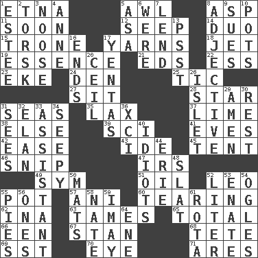 ACROSS 1. Inactive volcano in Sicily 5. Leather borer 8. Viper 11. Within a short period 12. Ooze 14. Superhero pair 15. Marketplace scale 17. Tall tales 18. Passenger plane 19. Core 21. Begley and Asner 22. Double-curved letter 23. Make supply last 24. Lair 25. Nervous spasm 27. Be seated 28. Play the lead 31. Oceans 35. Not strict 37. Citrus frut 38. Otherwise 39. _-fi 41. Nights before holidays 42. Comfort 43. Binary compound 45. Portable shelter 46. Sever or remove by pinching or nipping 47. Big collection agency 49. Symbol (abbr.) 51. Petroleum 52. Lion 55. Plant holder 57. Black tropical American cuckoo 60. Pulling into pieces 62. _ tizzy (2 wds.) 63. Corrects by punishment or discipline 65. Add up to 66. Car or cant ending 67. Comedian Laurel of Laurel & Hardy 68. False hair 69. Fast jet (abbr.) 70. Sight organ 71. Ancient Greek god of war DOWN 1. First name in cosmetics 2. Cod relative 3. Trap for birds or small mammals 4. Queen of England 1702-14 5. White ___ sheet 6. We are 7. Grant temporary use of 8. Descriptive word 9. Institutes legal proceedings 10. Plant holders 13. Inconspicuous attention getter 16. Conclusions 17. Gossips 20. To provide with a ceiling 26. Small island 29. So be it 30. Respite 31. Observes 32. Flair 33. Aide 34. Oozy 36. One more than ninety 40. Foolish or stupid persons 44. One of the Great Lakes 48. Narrow board 50. Floor protectors 52. 61 cubic inches 53. Maternal 54. Stares 55. Sliced desserts 56. Washington bills 58. Nathan's nickname 59. "If ____ say so..." 61. Round or rotation of duties 64. Compass dir.