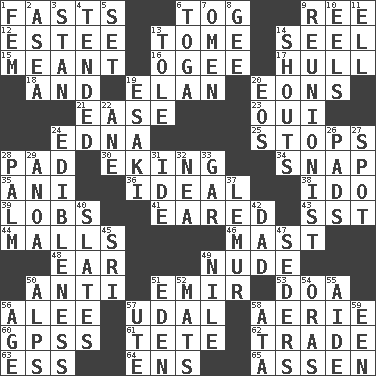 ACROSS 1. Goes without food and/or water 6. Coat; cloak 9. To separate or throw off 12. First name in cosmetics 13. Heavy book 14. Sew up the eyelids of hawks and falcons 15. Intended 16. Double curve, resembling the letter S 17. Frame or body of a ship 18. Also 19. Liveliness 20. Immeasurably long periods of time 21. Comfort 23. Fr. "Yes" 24. Pulitzer Prize-winning author Ferber 25. Closes up, plugs up 28. Groovy apt. 30. Supplementing with great effort 34. Fastener 35. Cuckoo 36. Perfect 38. Wedding promise 39. Tennis shots 41. Having ears or earlike features 43. Fast jet (abbr.) 44. Promenades 46. Vertical spar for supporting sails 48. Ewer handle 49. Naked 50. Opposed to 51. Arab leader 53. ___ good deed 56. Toward shelter 57. Allodial 58. Nest on high 60. Global Positioning Systems (abbr.) 61. False hair 62. Swap 63. Curvy letter 64. Followers of ems 65. NE Netherlands city DOWN 1. Opposite of masc. 2. Toward the sea 3. Comedian Laurel of Laurel & Hardy 4. Looked after 5. Arrange properly for use 6. Ancient Roman robe 7. Sign of something about to happen 8. Unit of force equal to gravity 9. One who advocates reunion 10. Snakelike fish 11. Pipe bend 13. Lacquered or enameled metalware 14. Yells 19. 1973 Nobel Price Winner (Physics) Leo 20. Greek goddess of the dawn 22. One (Scot) 24. The property of being fit to eat 26. Groovy apts. 27. Blemish 28. Inside of hand 29. Small Philippine buffalo 31. Binary compound 32. Teachers' org. 33. Slender fish 37. Arboreal primate 40. Chalkboards 42. Male parent 45. _ Lanka 47. Spring feasts 49. The longest river in the world 50. High mountains 51. Genesis locale 52. Floor coverings 54. Mouths or openings 55. Assistant 56. Mature 57. Shoshoni 58. "One Day ___ Time" 59. Car or cant ending