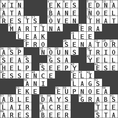 ACROSS 1. Acquire through effort 4. Makes supply last 8. Pulitzer Prize-winning author Ferber 12. _ moment's notice (2 wds.) 13. Object of repulsion 14. Christmas carol 15. Musical pauses 18. Baking chamber 19. Not this but _ 20. Chrissie's court nemesis 22. Period 23. Path through which fluid escapes 24. Area sheltered from the wind 25. Away 26. Legislator 30. Viper 33. Parts of speech 36. Musical group of three 37. Oceans 39. Girls' org. (abbr.) 40. Shout 41. Aid 42. Not well drained, as in land 44. Compass dir. 45. Gist 47. Connecticut Ivy Leaguer 50. Black tropical American cuckoo 51. Falls behind 53. Supplement with great effort 54. Normal relaxed breathing 57. Competent 59. 24-hour periods 61. Takes hold of 63. Den 64. 43,560 square feet 65. Make a knot 66. Ancient Greek god of war 67. Fermented drink made from hops 68. R.R. building DOWN 1. Armed conflict 2. A whole individual unit 3. Rhinal 4. Inky black, to poets 5. Polynesian shrub of the pepper family 6. Compass dir. 7. Elected rep. 8. Plea 9. Capital of the state of Qatar 10. Teachers' org. 11. Keyboard modifier key 16. Unclean, religiously 17. Play the lead 21. Visual representation of an object 22. Car or cant ending 24. French article 26. Fastener 27. Relationship diagram 28. Lubricates 29. Hero or heavy, e.g. 30. American tennis player Robert 31. Observes 32. Friends 34. Double curve, resembling the letter S 35. Purpose 38. Orators 42. _-fi 43. Sharp bark 46. Compass dir. 48. Long (Scottish) 49. Russian composer Stravinsky 52. Theater features 53. Writer Wiesel 54. Jane of fiction 55. One who uses or employs something 56. "This won't hurt ____!" 57. Chicken ___ king 58. Oblong piece of solid material 59. Pat or tap gently 60. Adept person 62. Ocean