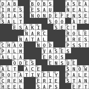 ACROSS 1. Small moist lump or mass 4. Moves up and down 8. Toward the sea 12. Angers 14. Son of Isaac 15. Actress Patricia 16. Prejudice 17. Unrelated to defense, as in spending 20. Table seasoning 21. "Barney Miller" actor Jack 22. Had dinner 23. 1973 Nobel Price Winner (Physics) Leo 27. Religious group 29. Drug cop 31. Hero or heavy, e.g. 34. Relating to or accompanying birth 35. Ancient Greek god of war 36. US Secretary of Labor Elaine L. _ 39. Lower and raise head in agreement 41. Inconspicuous attention getter 42. Inside of hand 43. Flower holders 46. Silent film actress Nazimova 47. Greek god of love 48. Lyric poems 51. Follow as a consequence or result 54. Keyboard modifier key 56. Adept person 58. Frozen precipitation 61. Rotating or pertaining to rotation 66. Diluted with white 67. Ship's personnel 68. One of the Great Lakes 69. Comedian Laurel of Laurel & Hardy 70. The bottom of a shoe or boot 71. Plant excrements 72. Bank Draft (abbr.) DOWN 1. Rights 2. Operatic vocal solo 3. Memphis, Tenn. Street 4. Benjamin's nick name 5. Bear (Spanish) 6. Bar 7. Beer foam 8. One (Scot) 9. Elected representatives 10. 90 degrees 11. Toward shelter 13. Fast planes 18. Greek goddess of the dawn 19. Enemy 24. Santa ___, CA 25. Krazy ___ of comics 26. SW Asia republic 28. Dice game 30. Garlic unit 32. French article 33. Eastern Standard Time (abbr.) 34. Wanderer 36. Tax preparer (abbr.) 37. Actor Linden 38. One to whom something is allotted 40. Have the gumption 44. Male offspring 45. Curvy letter 49. Ingest 50. _-fi 52. United States Postal Service (abbr.) 53. Related on the mother's side 54. Bowlike part 55. Old wives' tales, e.g. 57. Nights before holidays 59. Norwegian king 60. Left 62. Leather borer 63. Period 64. Mouth edge 65. It is so